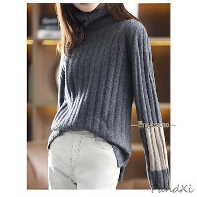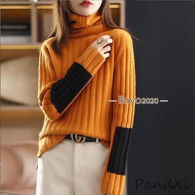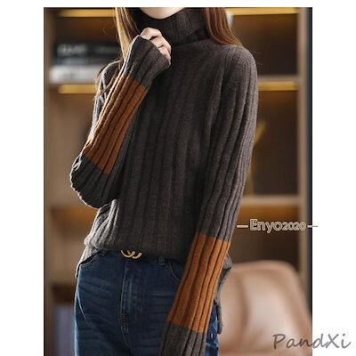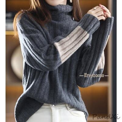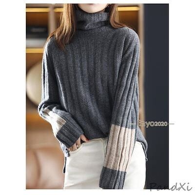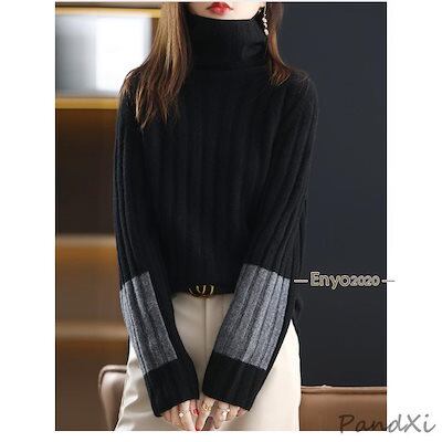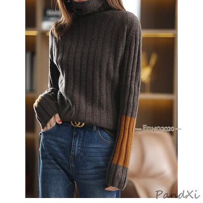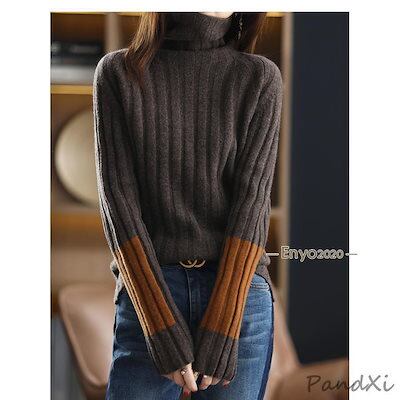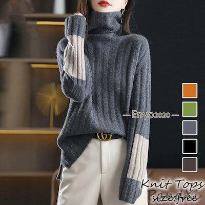 ニットトップス レディース 秋冬 長袖セーター 配色 ハイネック ショット丈セーター ゆったりプルオーバー オシャレ 大人ニットインナー