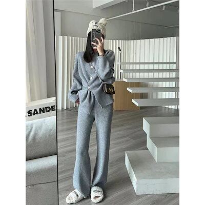秋冬 新作 おしゃれ 気質 ニット アウター 二点セット レディースセットアップ 上下セット セーター ワイドパンツ セットアップ 通勤 シンプル 福袋