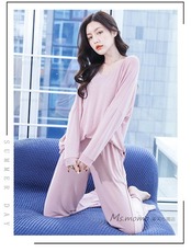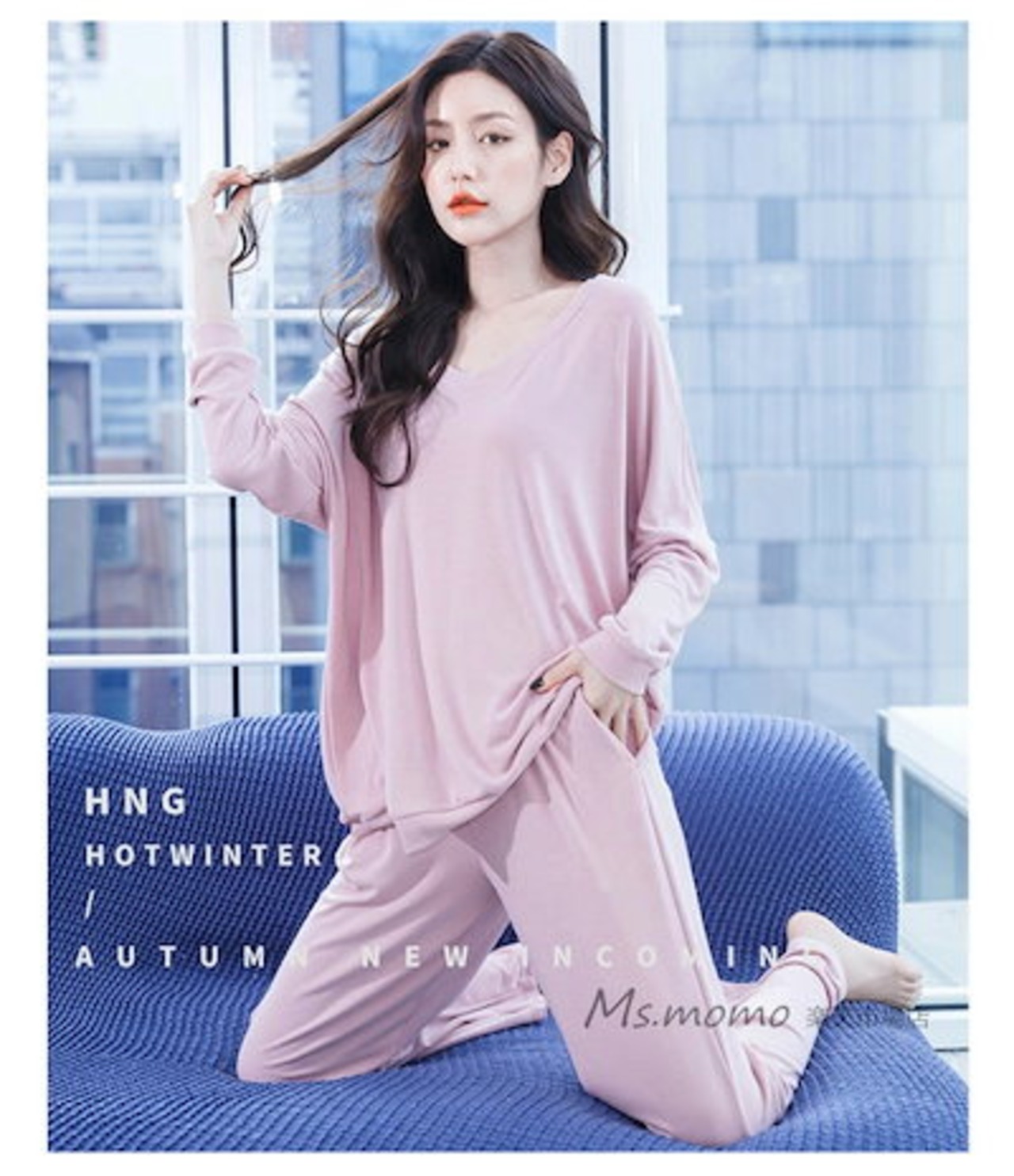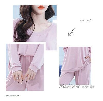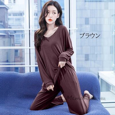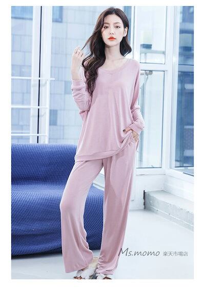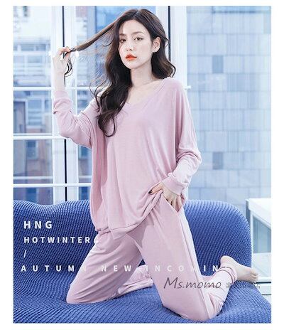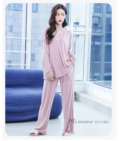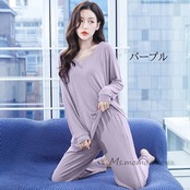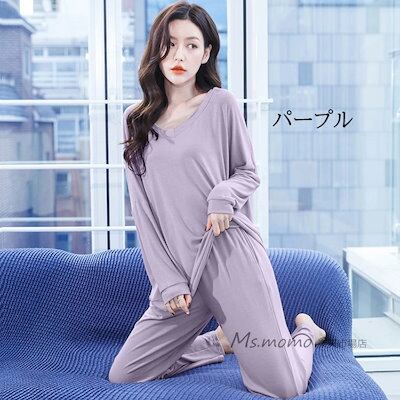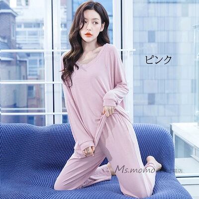 ロング丈ワイドパンツ上下セット 大人可愛いパジャマ 秋冬 モーダル綿ルームウェア 部屋着 オシャレ韓国風 パジャマ 寝間き ゆったり 無地Vネック レディース 女性 長袖パジャマ 快適