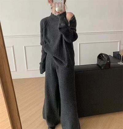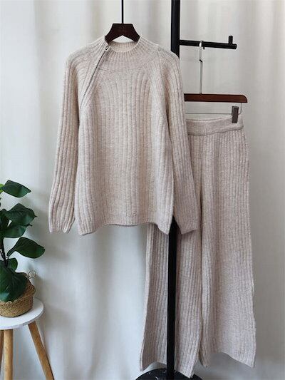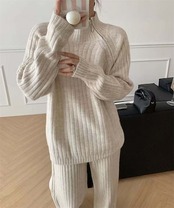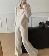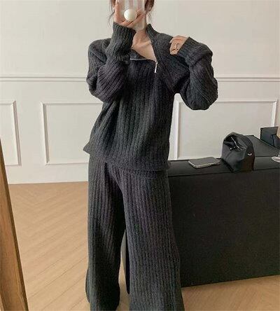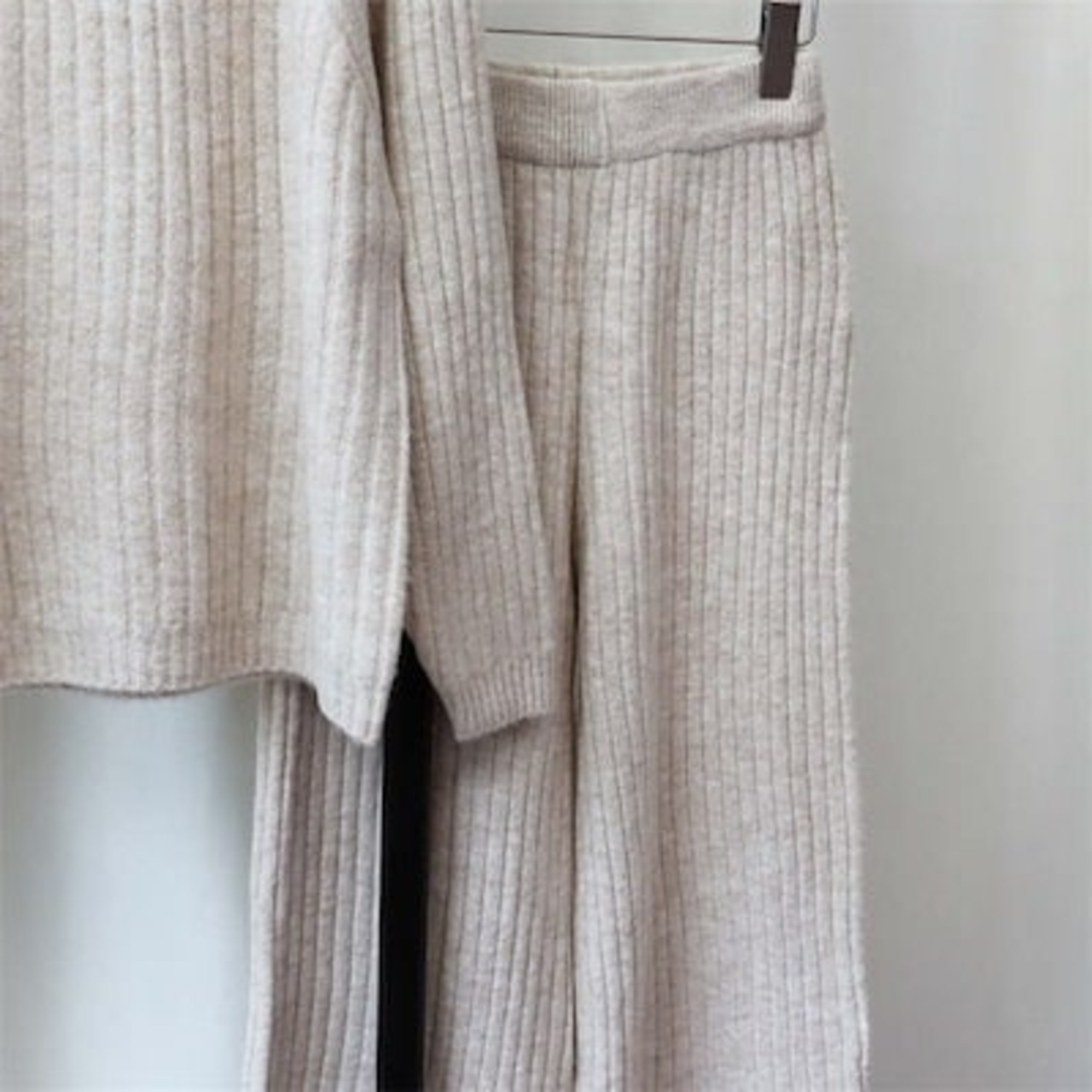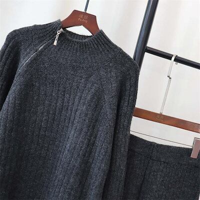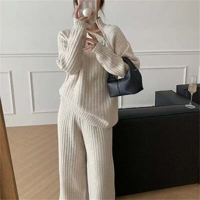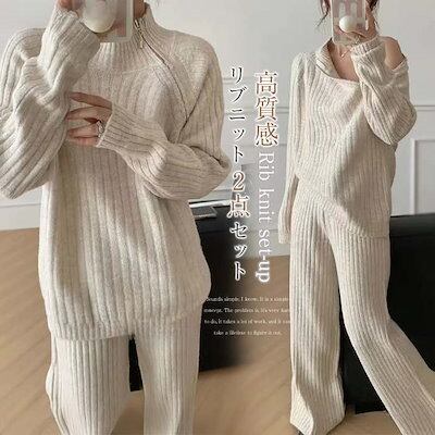 セットアップ トップス パンツ レディース 秋 冬 ニット 長袖 ハイネック 立ち襟 上下セット 大きいサイズ パンツセット プルオーバー ワイドパンツ ロング ロングパンツ ケーブル編み ケーブルニ
