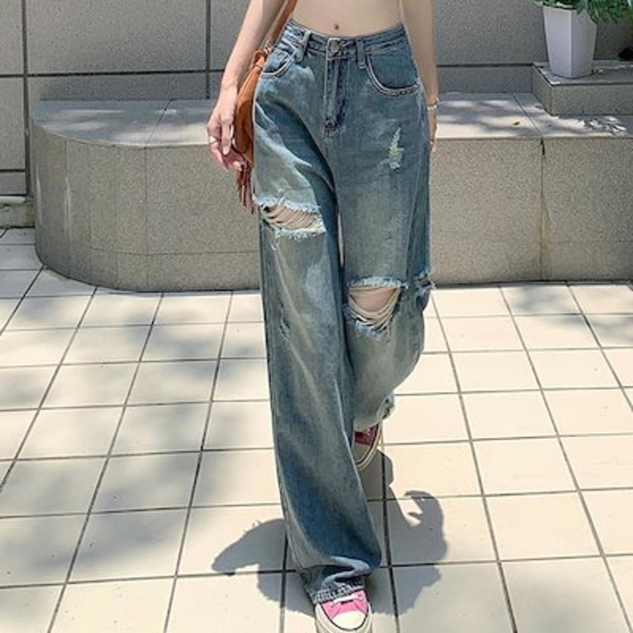 大人気 デニムパンツ 秋 新作 パンツ デニム ジーンズ ワイド ストレート ハイウエスト 細見え ウォッシュ加工 ダメージ 春 カジュアル ファッション お出かけ レディース 脚長効果 美脚効果