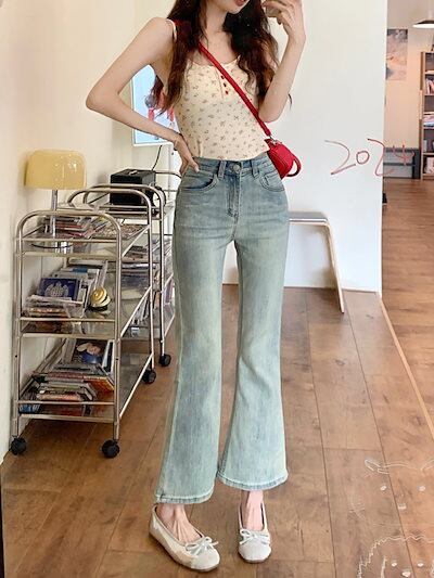 2024春夏パンツ デニム ジーンズ クロップド丈 アンクル丈 ワイドレッグ ハイウエスト 美脚効果 脚長効果 細見え 夏 黒 おしゃれ かわいい 韓国ファッション レディース お出かけ