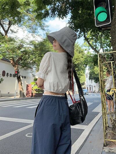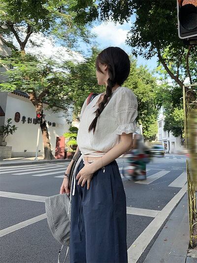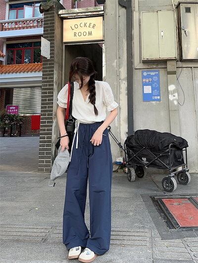 2024 春夏パンツ モップパンツ ロング丈 ワイド ウエストゴム ハイウエスト 美脚効果 脚長効果 細見え 夏 青 ブルー おしゃれ かわいい 韓国ファッション レディース お出かけ