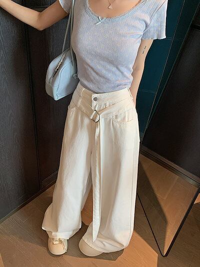 2024夏 韓国パンツ デニム ジーンズ ロング丈 ワイドレッグ ウォッシュ加工 ベルト ハイウエスト 美脚効果 脚長効果 細見え 夏 白 青 おしゃれ かわいい 韓国ファッション レディース お出か
