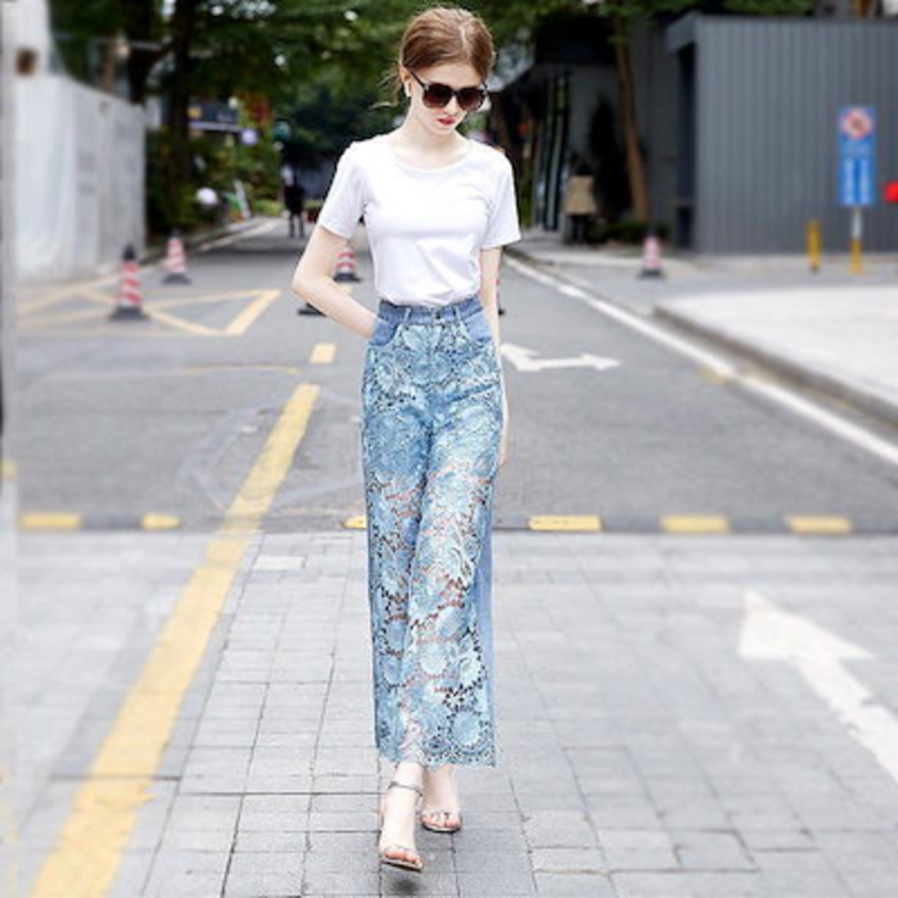 デニムボトムス 秋 デニムパンツ ハイウエスト ワイドパンツ レディース 夏 デニム ズボン 透かし彫りレース 設計 ジーンズ ゆったり ストレート デニム パンツ