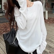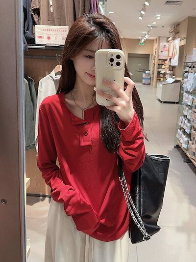 2024春夏トップス Tシャツ 長袖 ラウンドネック ボタン 薄手 ゆったり 細見え 夏 白 赤 おしゃれ かわいい 韓国ファッション レディース お出かけ