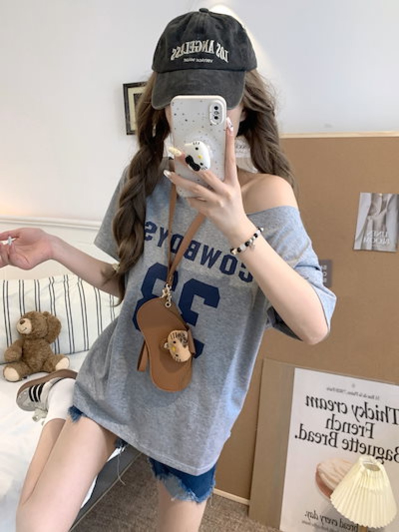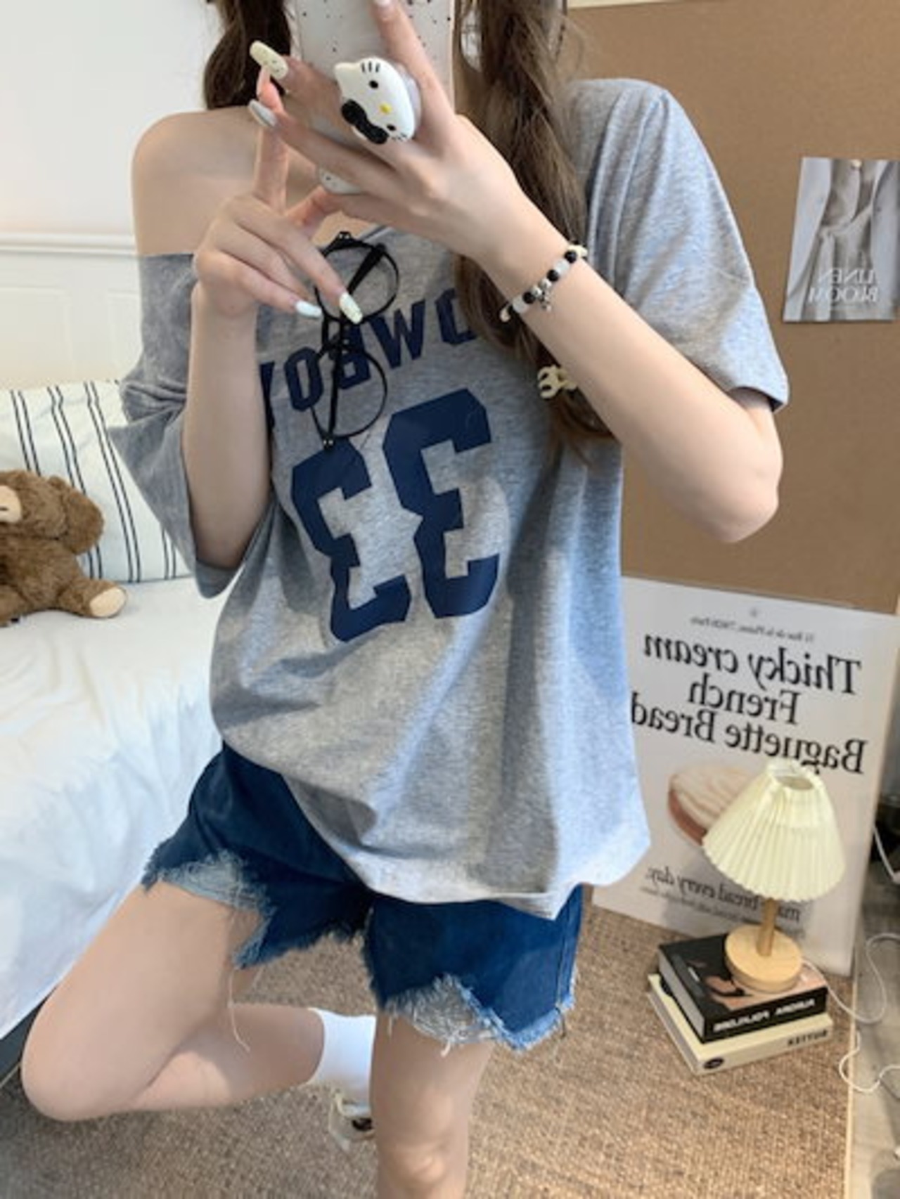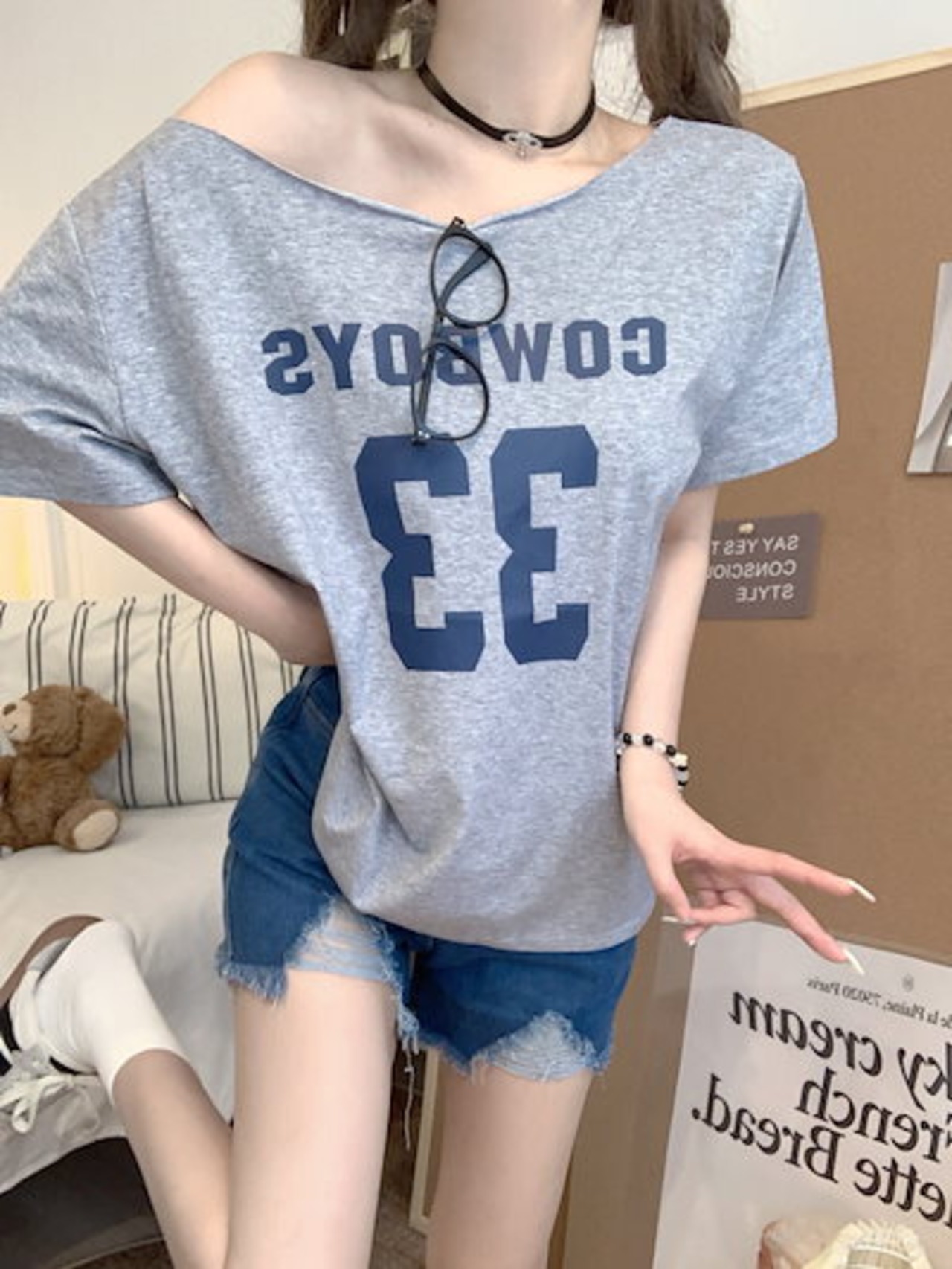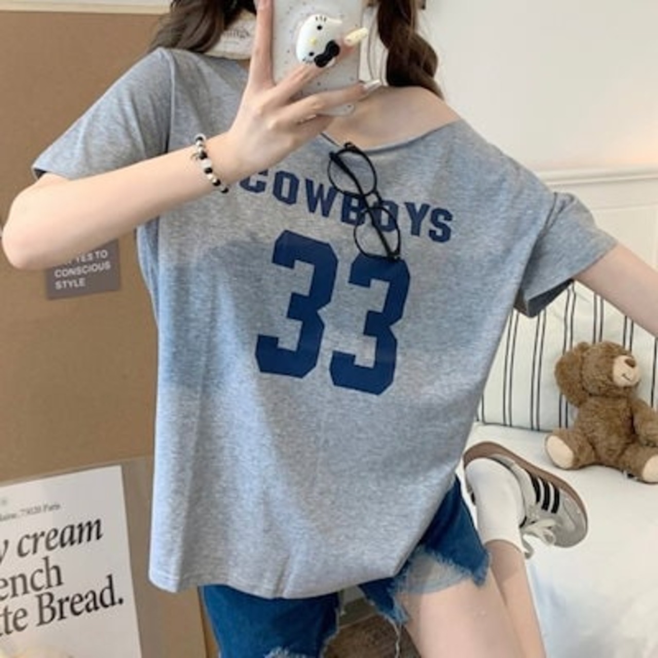 2024 夏トップス Tシャツ 半袖 数字 33 肩見せ スリム 細見え 夏 グレー おしゃれ かわいい ガーリー キュート 甘め 韓国ファッション レディース お出かけ