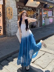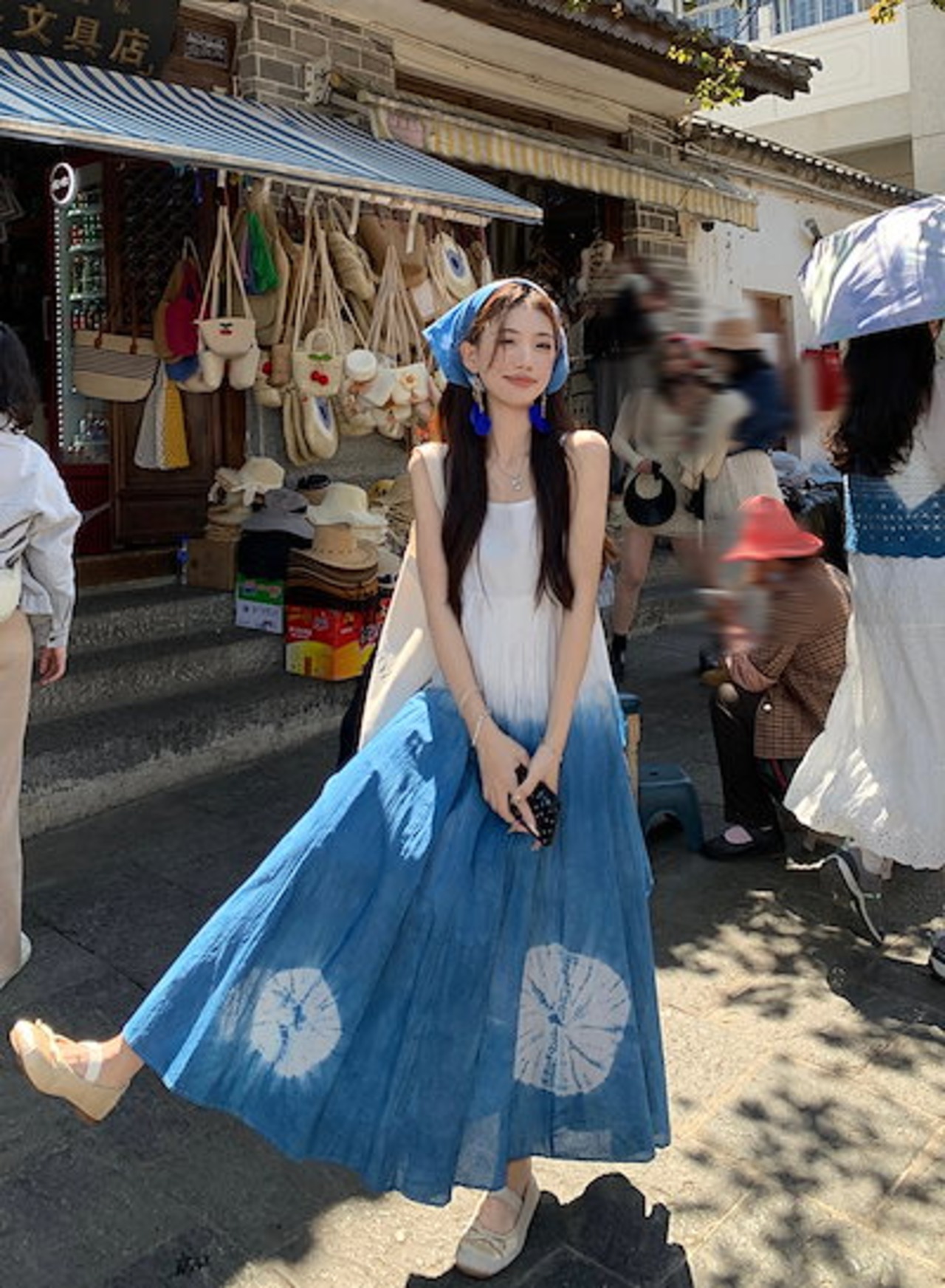 2024春夏タイダイ柄グラデーション キャミワンピース ノースリーブ ワンピース ロングワンピース 体型カバー レトロ 韓国ファッション レディース レトロ 大人可愛い