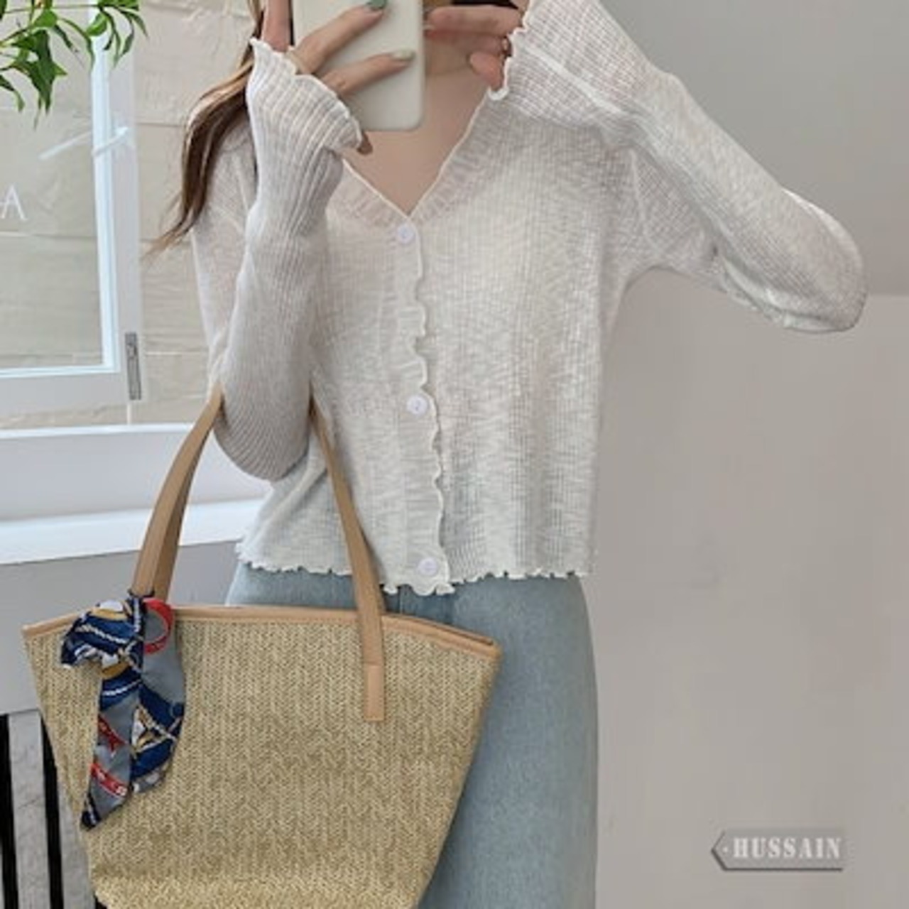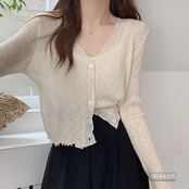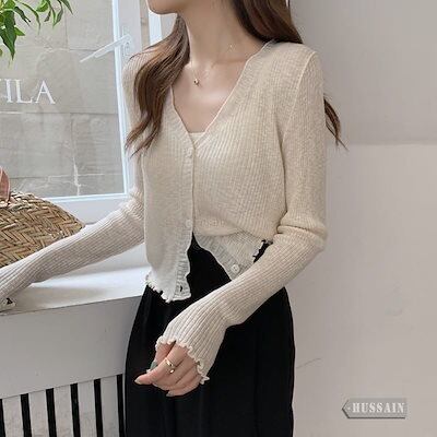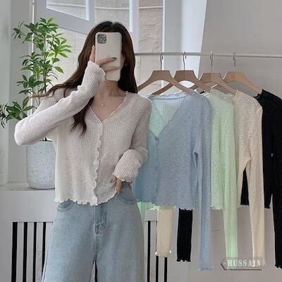 2024 夏 韓国 ライトニット カーディガン トップス 羽織り加工 ショート 薄手 長袖 紫外線対策 UV対策 きれいめ オフィス OLネックカジュアルフレンチフェミニンファッション韓国 レディース