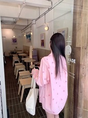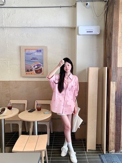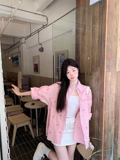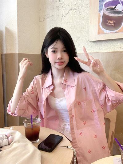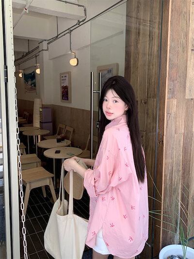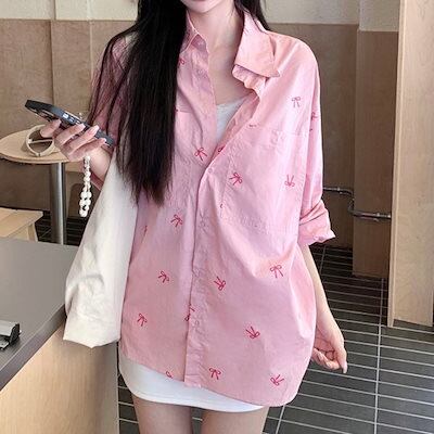 2024夏トップス シャツ リボン ボタン 長袖 丈長め ゆったり 細見え 夏 ピンク おしゃれ かわいい ガーリー キュート 甘め 韓国ファッション レディース お出かけ