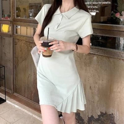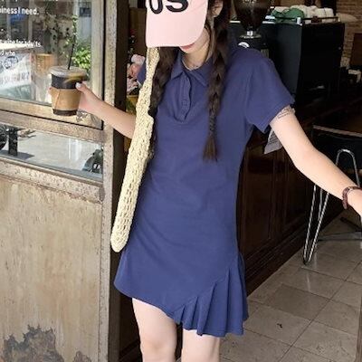 2024 春夏ワンピース ミニ丈 ポロネック 半袖 プリーツ アシンメトリー Aライン 細見え 夏 おしゃれ かわいい ガーリー キュート 甘め 緑 韓国ファッション レディース お出かけ