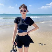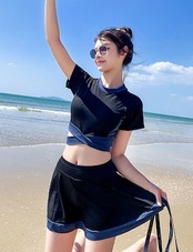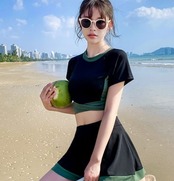 2024 2色 タンキニ ビキニ レディース 黒 バイカラー 体型カバー 水着 袖あり スカート スポーティー S M L XL 韓国 水着 上下セット セパレート カジュアル ミニスカート 半袖 T