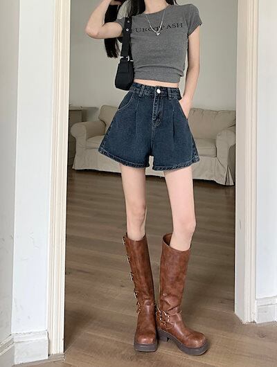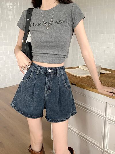2024 春夏パンツ デニム ジーンズ ショート丈 タック ハイウエスト 美脚効果 脚長効果 細見え 夏 おしゃれ かわいい 韓国ファッション レディース お出かけ