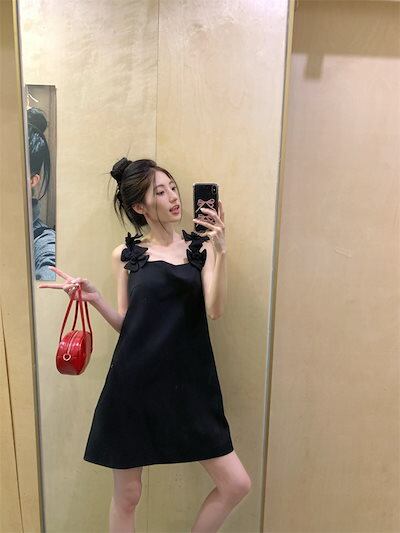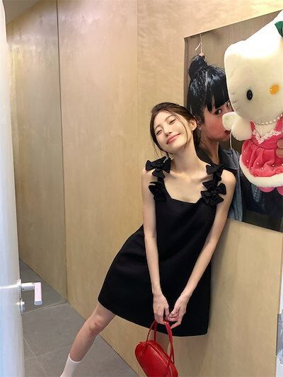 2024春夏ワンピース ミニ丈 スクエアネック ノースリーブ Aライン ゆったり 細見え 夏 おしゃれ かわいい ガーリー キュート 甘め 黒 ブラック 韓国ファッション レディース お出かけ