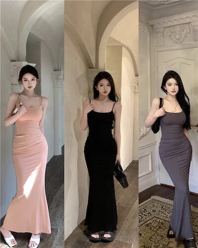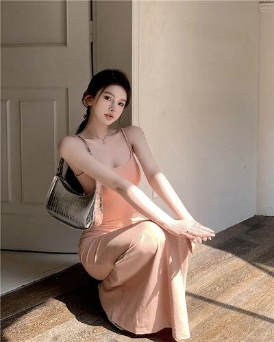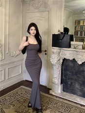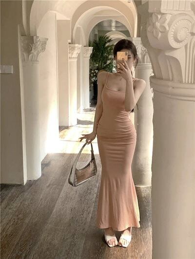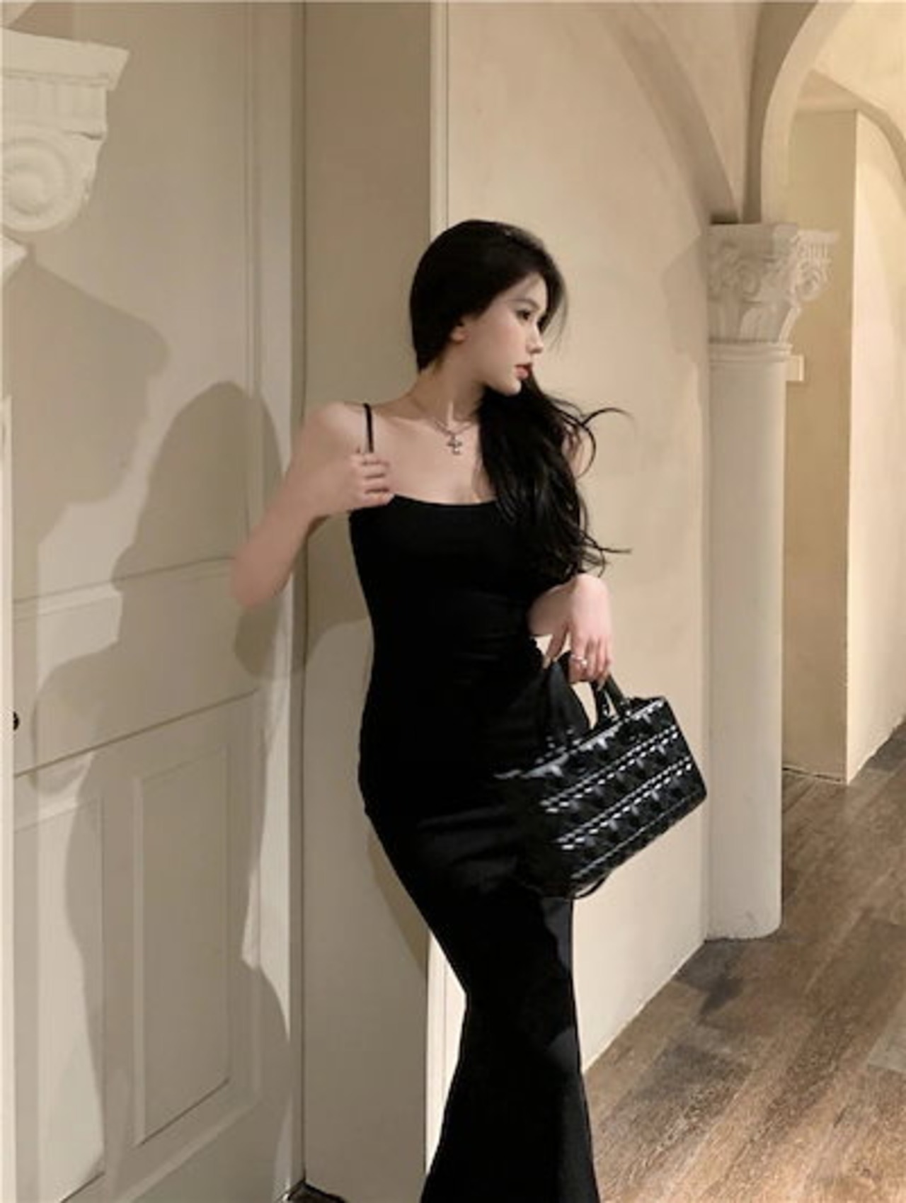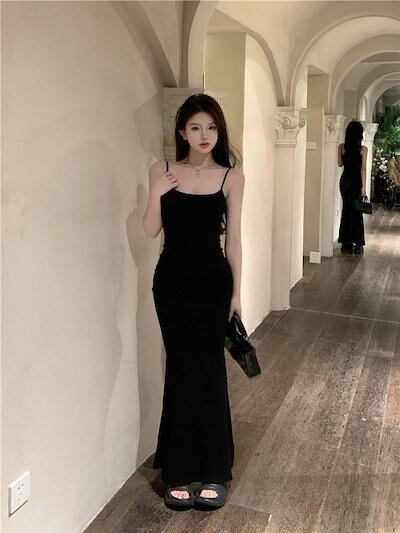 2024夏 韓国 ワンピース ロング丈 ゆったり Vネック キャミソール ハイウエスト フィッシュテールかわいい カジュアル おしゃれ 夏 ファッション フィッシュテールフレンチお出かけ