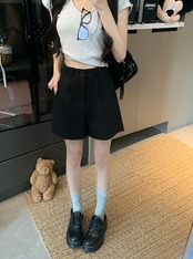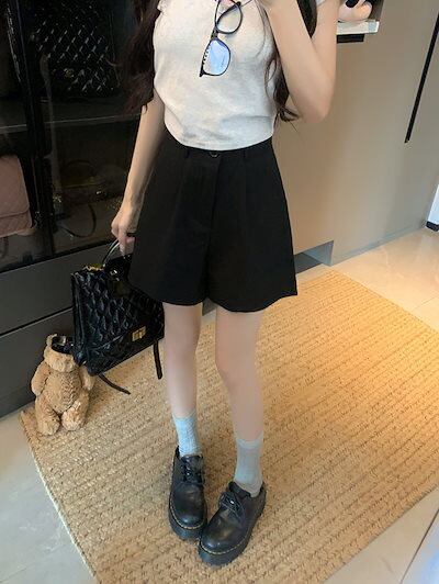 2024 春夏パンツ ショート丈 タック ワイド ハイウエスト 美脚効果 脚長効果 細見え 夏 黒 おしゃれ かわいい 韓国ファッション レディース お出かけ