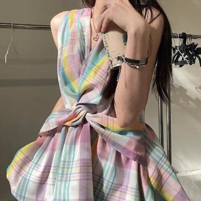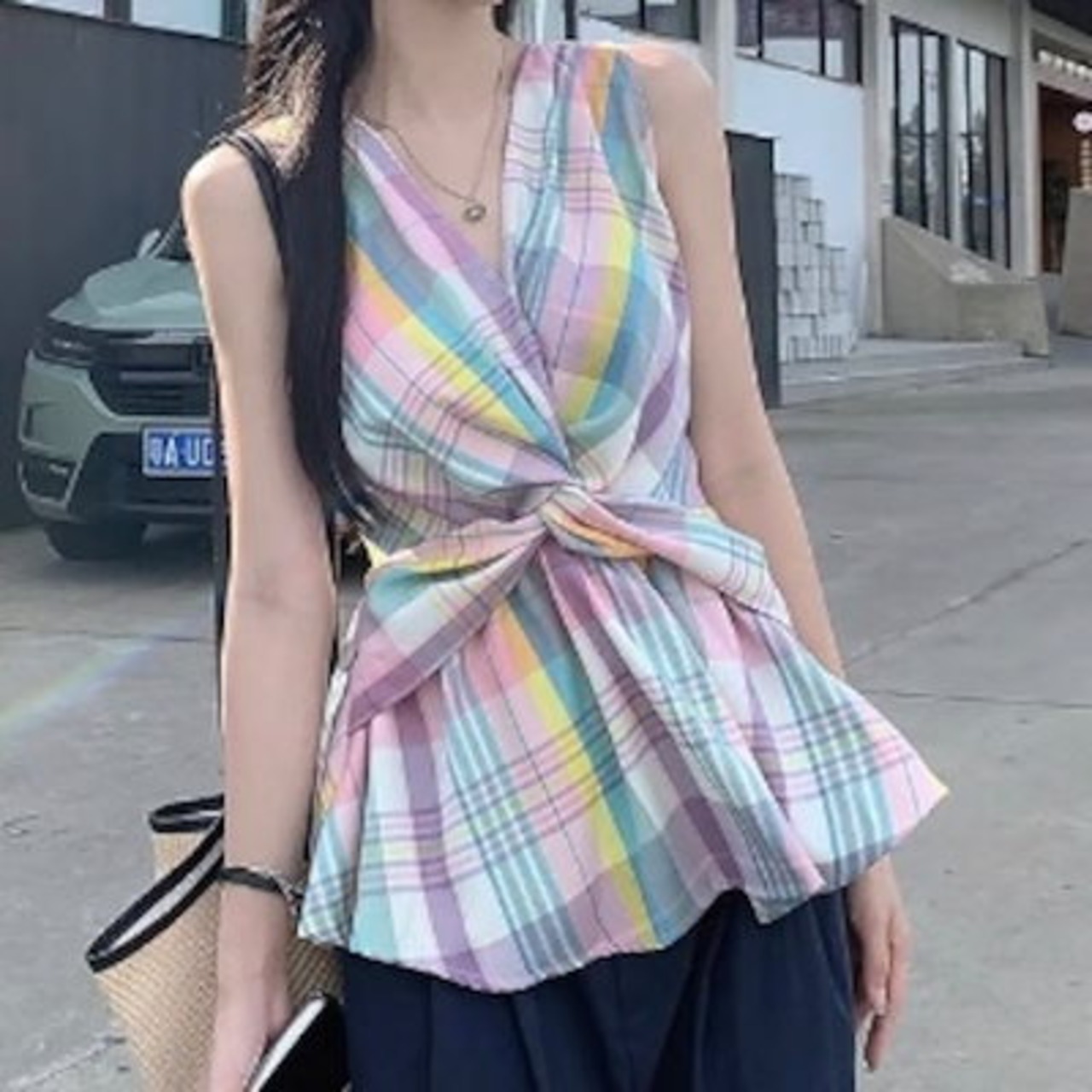 2024夏トップス ツイストシャツ Vネック チェック柄 ノースリーブ ゆったり 細見え 夏 カラフル ピンク おしゃれ かわいい キュート ガーリー 甘め 韓国ファッション レディース お出かけ