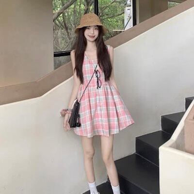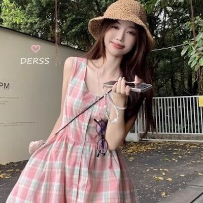 2024春夏ワンピース ミニ丈 Uネック ノースリーブ チェック柄 Aライン ゆったり 細見え 夏 ピンク おしゃれ かわいい ガーリー キュート 甘め 韓国ファッション レディース お出かけ