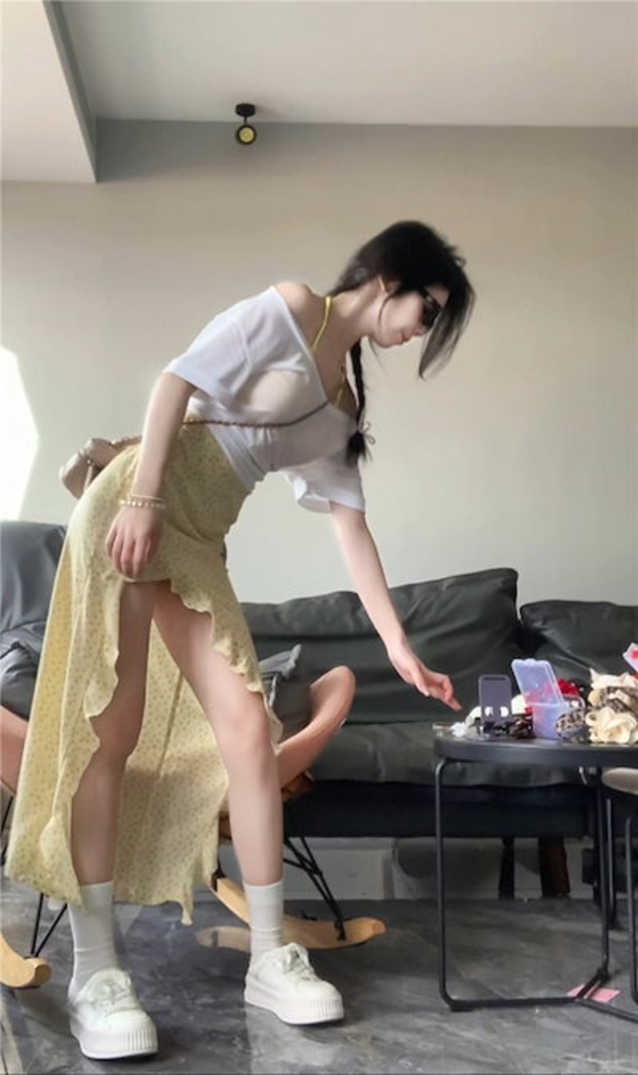 2024 春夏スカート ミモレ丈 Aライン 台形 スリット フリル ハイウエスト 美脚効果 脚長効果 細見え 夏 黄色 イエロー おしゃれ かわいい 韓国ファッション レディース お出かけ