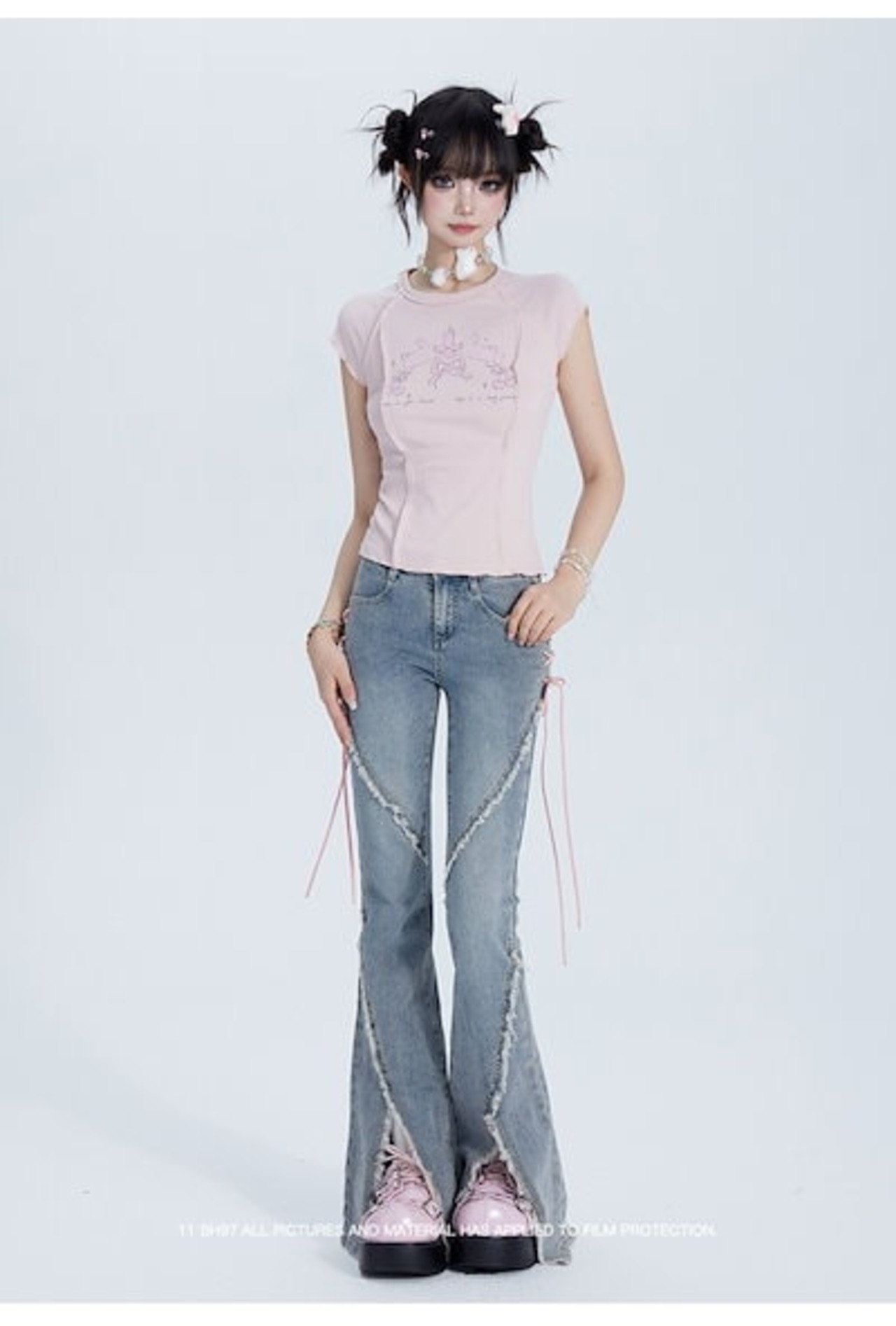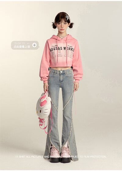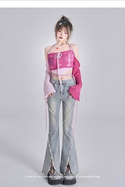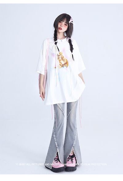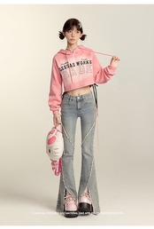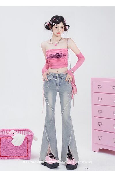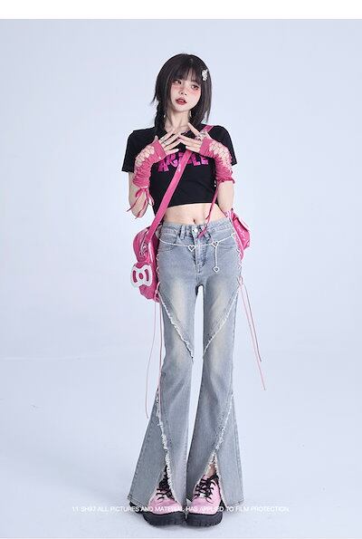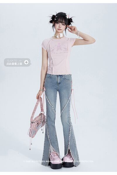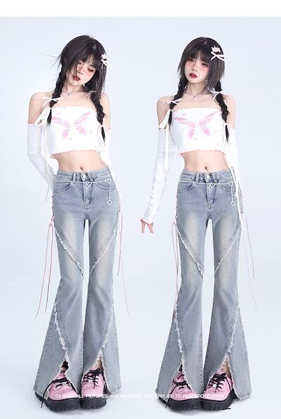 2024夏 韓国 デニムパンツ ボトムス ジーンズ ハイウエスト ファッション系ワイド スタイルサイド紐が付い ゆるダボ ジーンズ シルエット加工 レディース カジュアル メンズライク