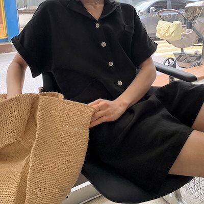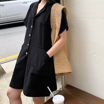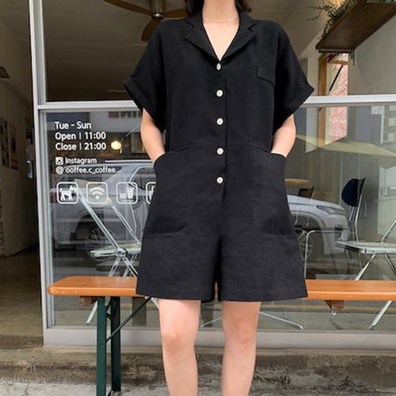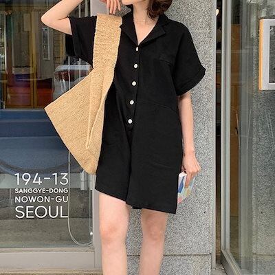 2024夏 韓国オールインワン Vネック ボタン 半袖 ポケット ハーフパンツ 細見え 夏 黒 ブラック おしゃれ かわいい 韓国ファッション レディース お出かけ
