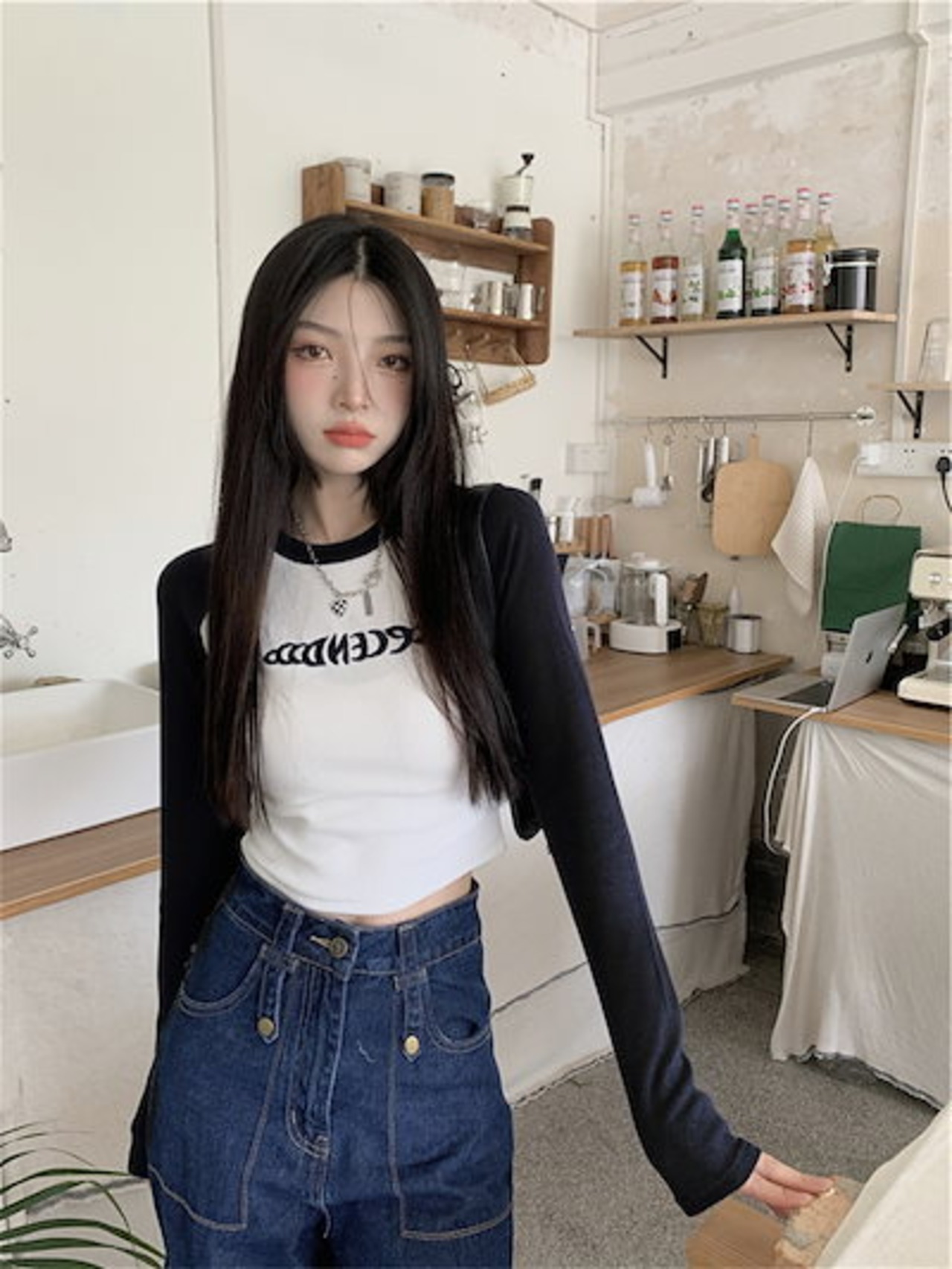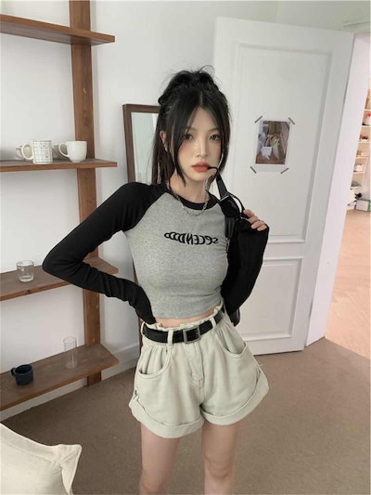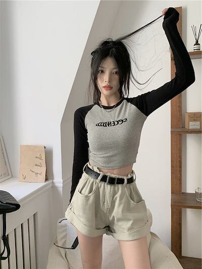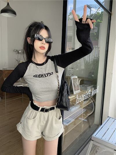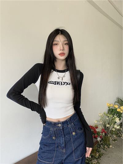 2024夏 韓国 トップス 長袖 可愛い おしゃれ タイトフィット カットソー ラウンドカラー 重ね着丈 スリーブ 女っぽ レディース Tファッション系 フェミニン きれいめ 色っぽ プリント