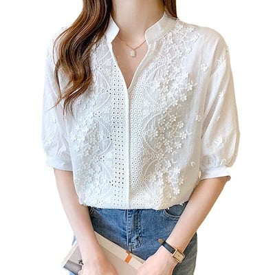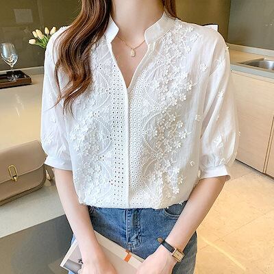 シアーシャツ Vネックスタンドカラー ブラウス ロング ブラウス シャツ レディース 半袖 バルーン袖 綿 トップス おしゃれ レース 通勤 立ち襟 きれいめ 仕事 可愛い