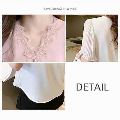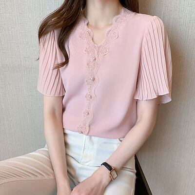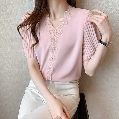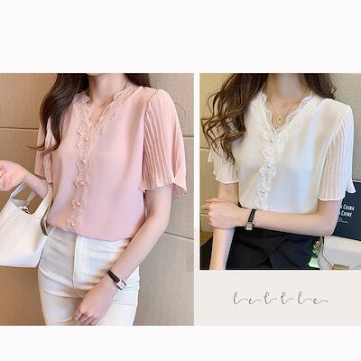 ブラウス レディース 40代 春夏新作 オシャレブラウス 白シフォンシャツ 半袖トップス レースVネ