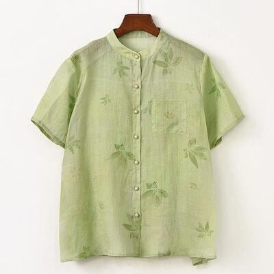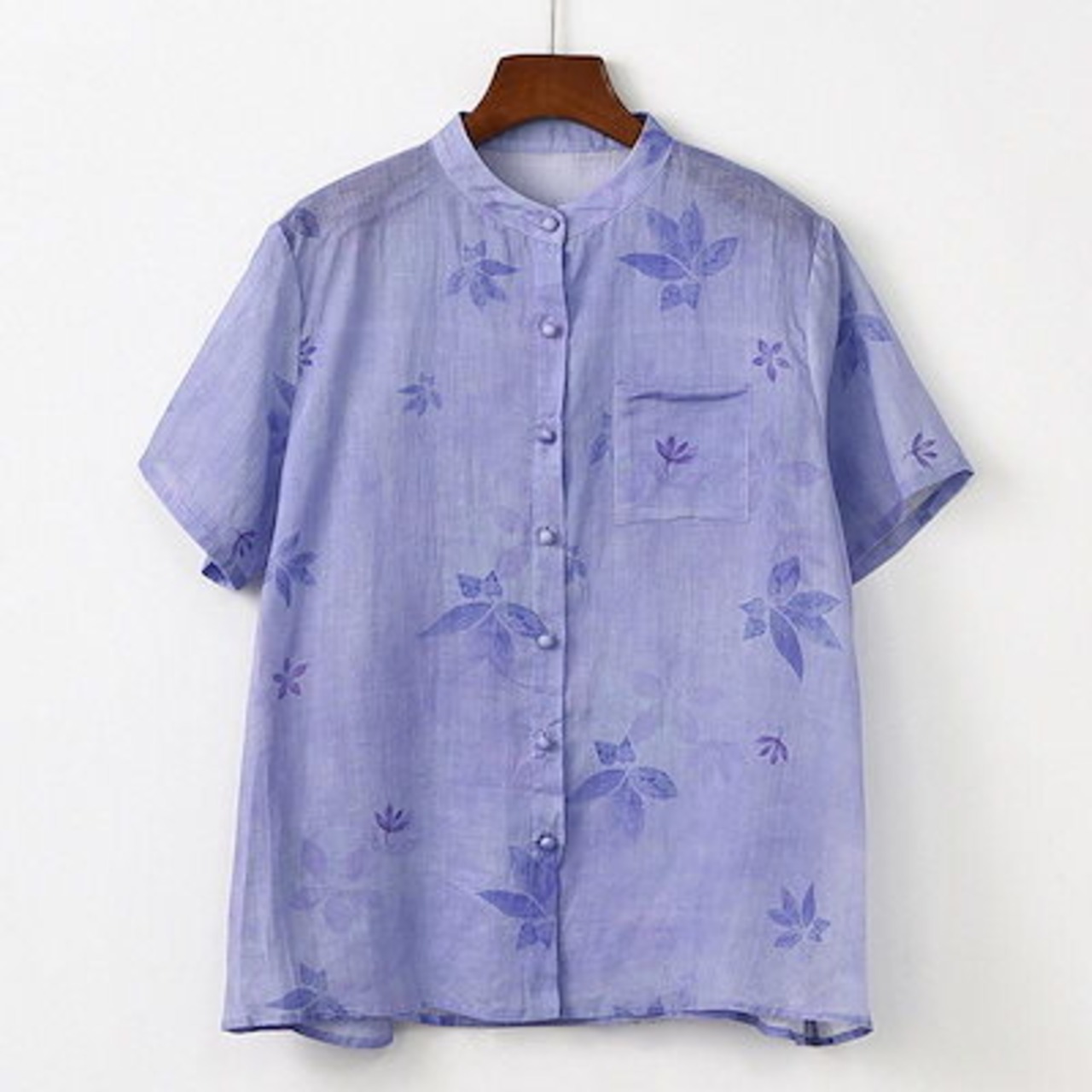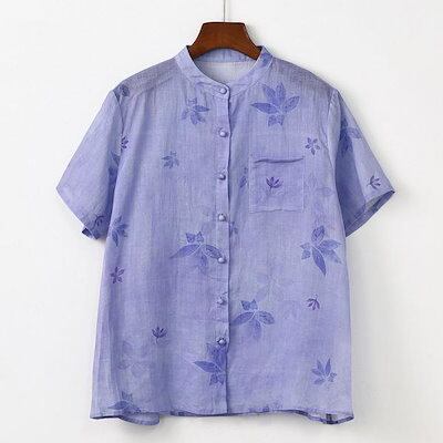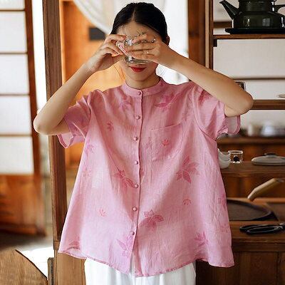 シャツ半袖レディース綿麻混ブラウス花柄個性的リネンシャツ体型カバー大きいサイズカジュアルトップス夏薄ゆったり柔らかい