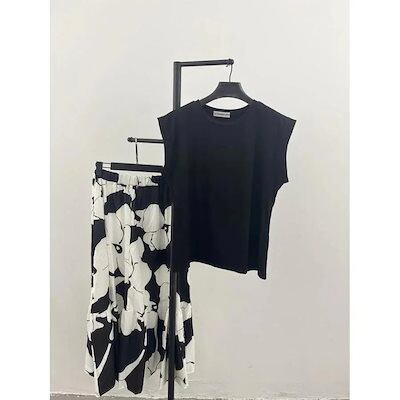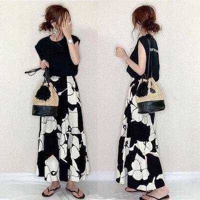 セットアップレディースカットソー半袖トップスTシャツスカート花柄ロングスカートマキシ丈おしゃれ通勤3040大きいサイズ着痩せ