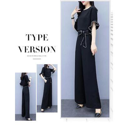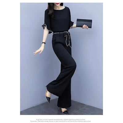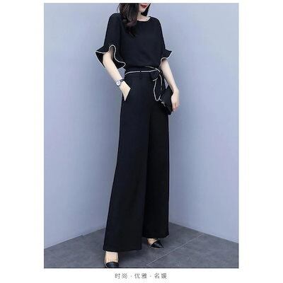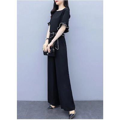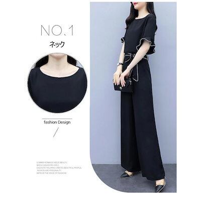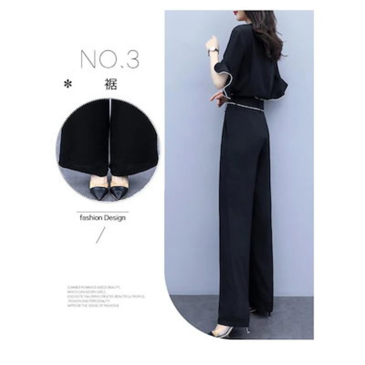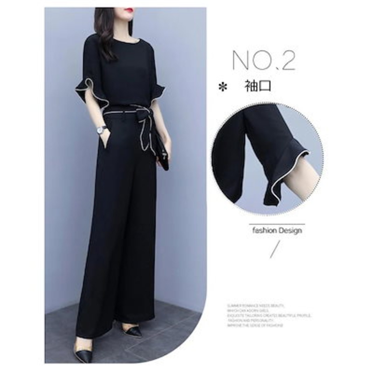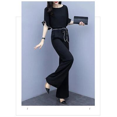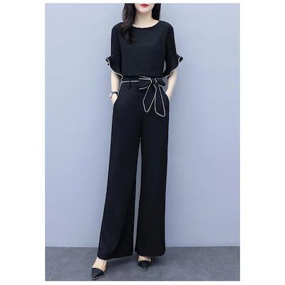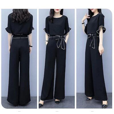 セットアップ レディース 春夏 オシャレセットアップ 半袖ブラウス 黒 ロング丈ワイドパンツ シフォンセット カジュアル 韓国風 通勤 40代 大きいサイズ