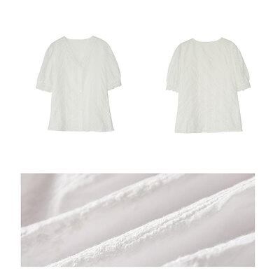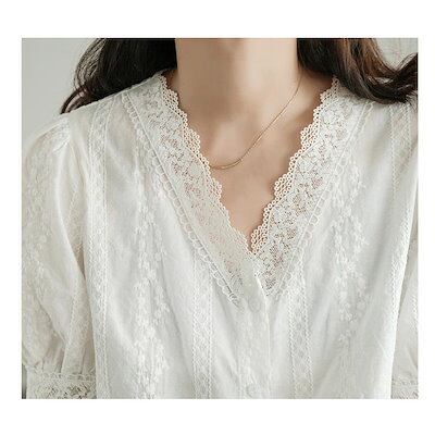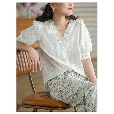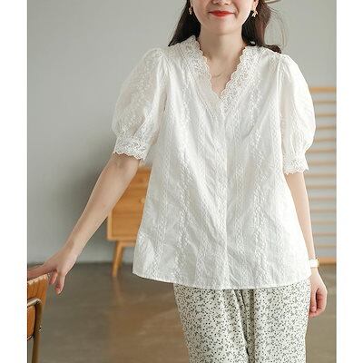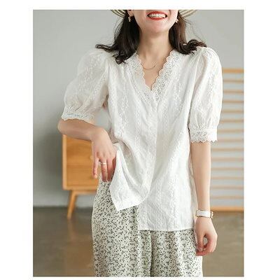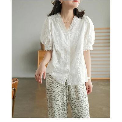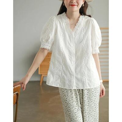 ブラウス レディース 40代 春夏新作 オシャレブラウス 白レースシャツ 半袖トップス vネック パフスリーブ 上品 大人 通勤OL ゆったりシャツカジュアル 30代