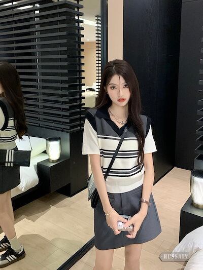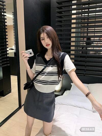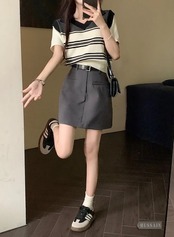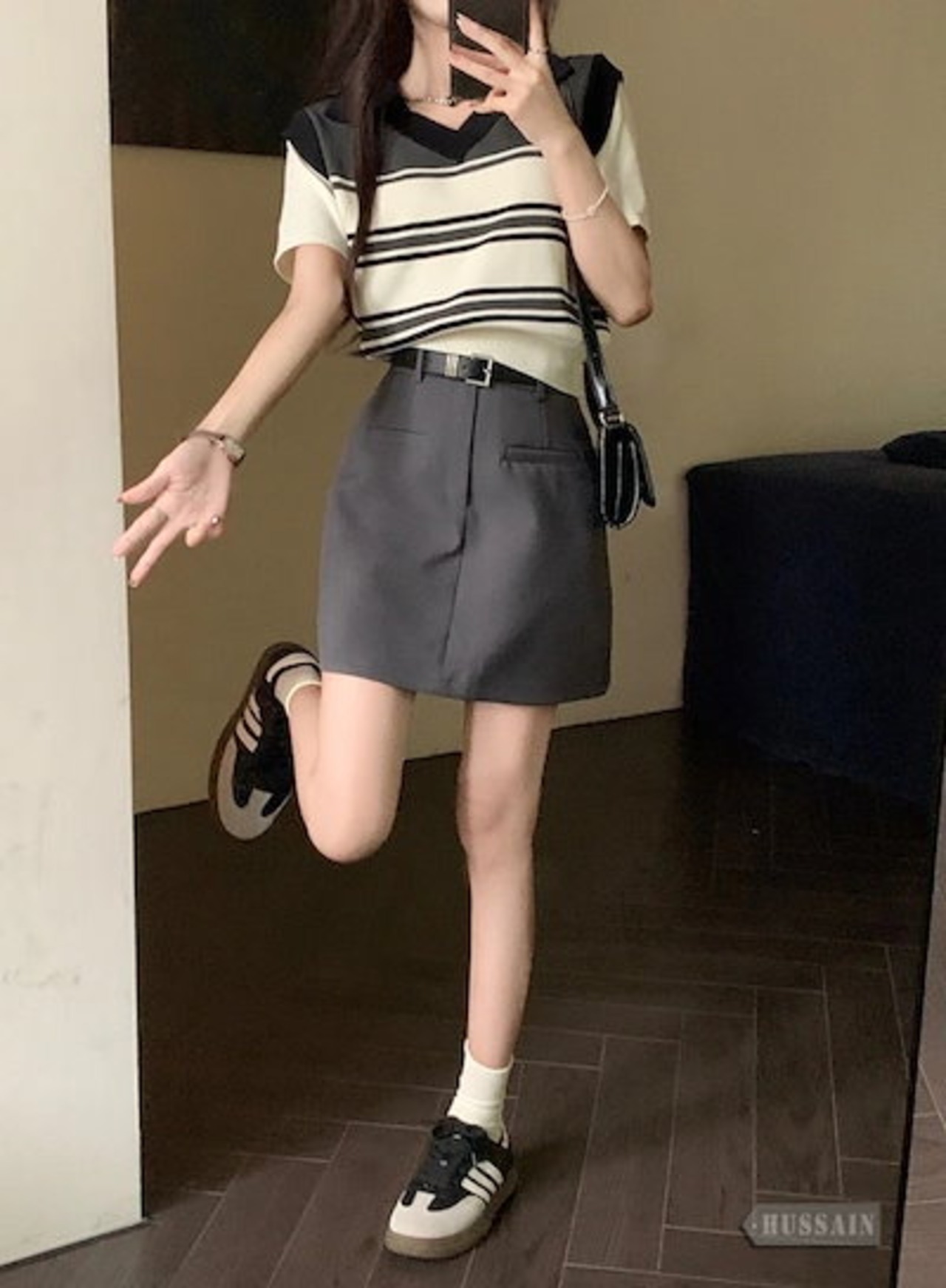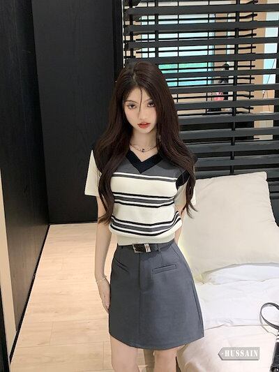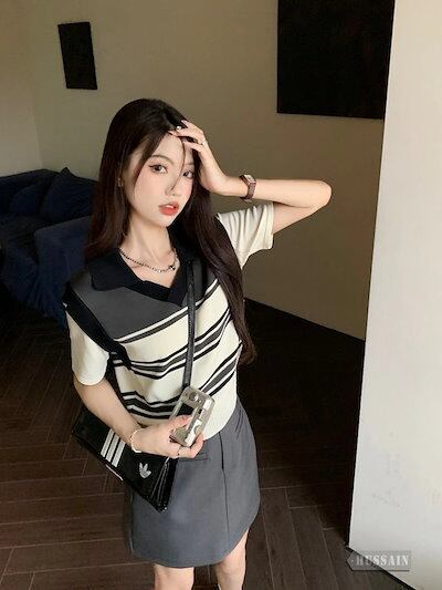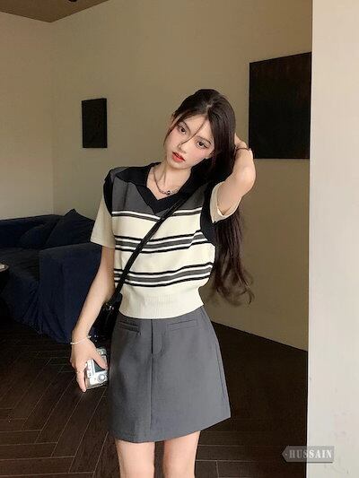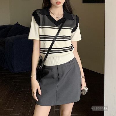 セットアップ レディース 2点セット 上下セット フェイクツーピース フェイクレイヤード ストライプ ニット トップス ミニ丈 スカート ミニスカ グレー 夏 可愛い おしゃれ 半袖 韓国