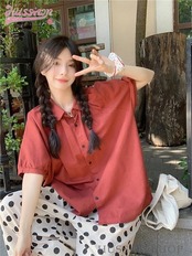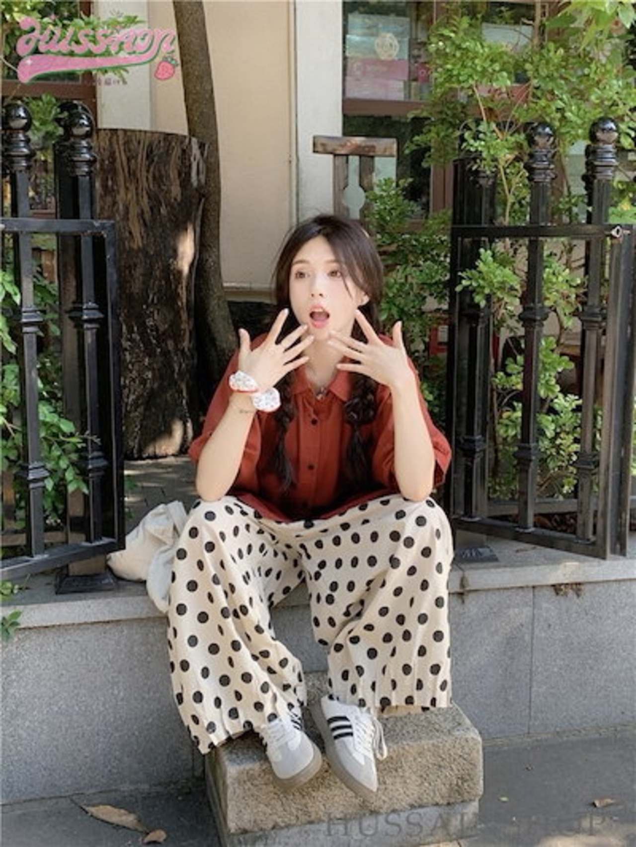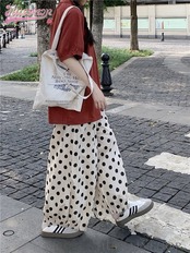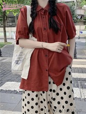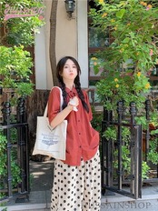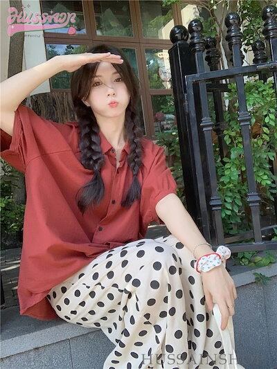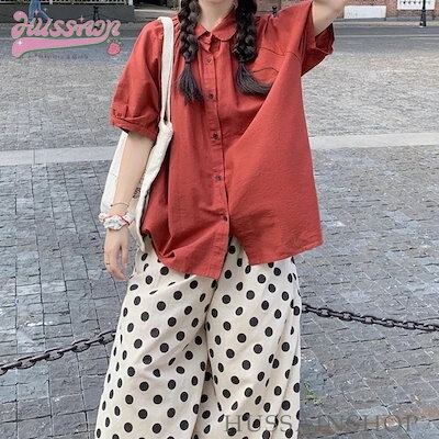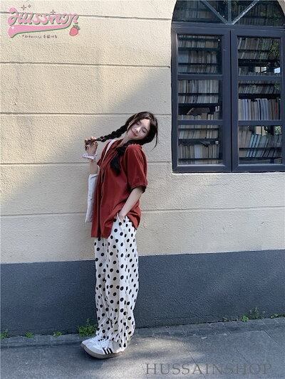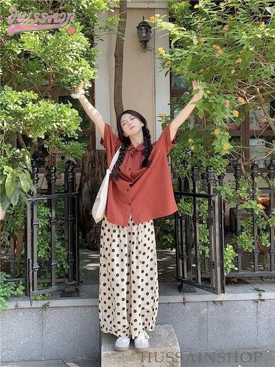 トップス パンツ シャツ オレンジ 半袖 襟 ボタン ワイドパンツ ドット 大きめサイズ ゆったり リラックス かわいい おしゃれ カジュアル 夏 韓国ファッション レディース お出かけ