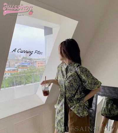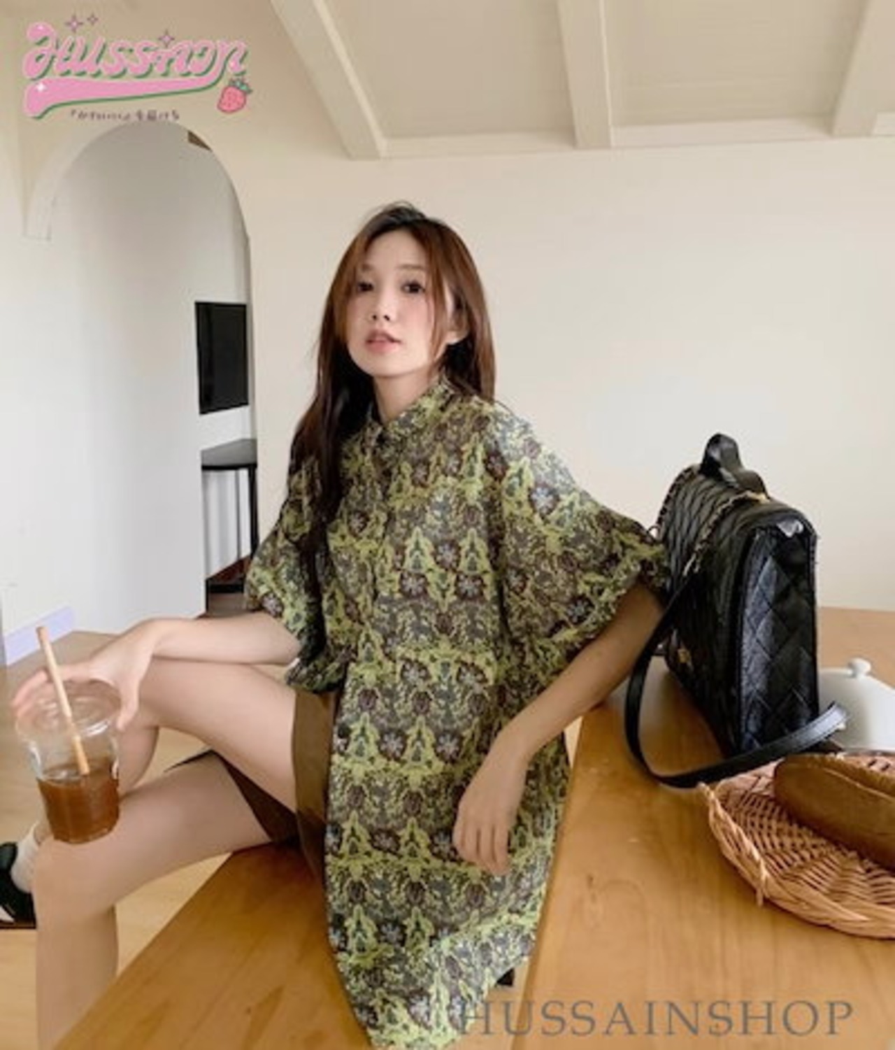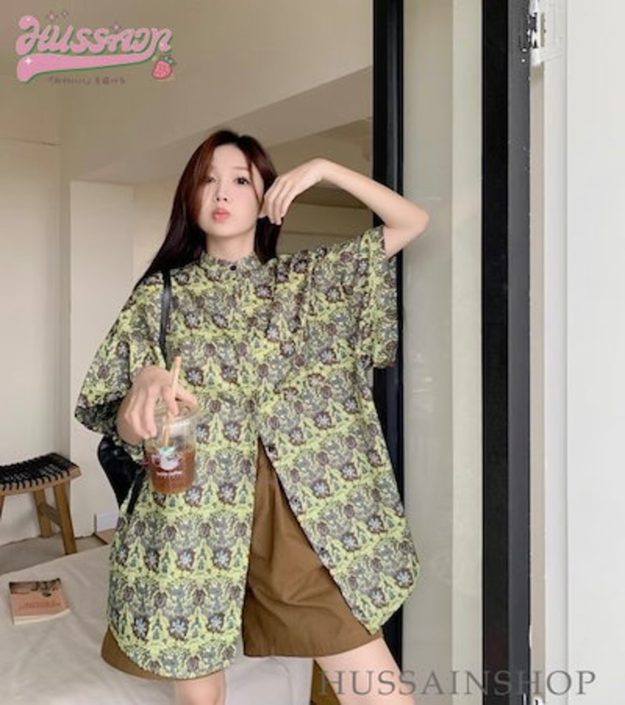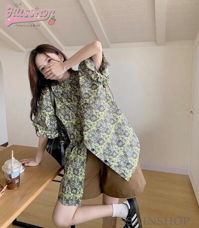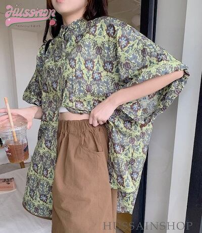 トップス シャツ 半袖 大きめサイズ ゆったり リラックス グリーン 緑 花柄 かわいい おしゃれ 大人っぽい カジュアル 夏 韓国ファッション レディース お出かけ