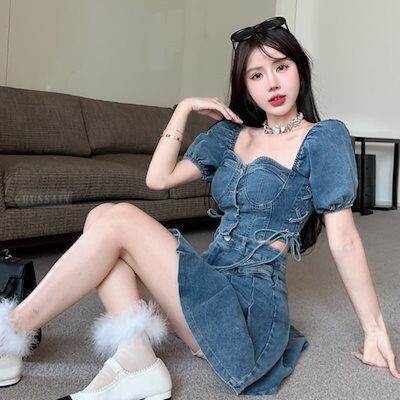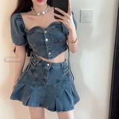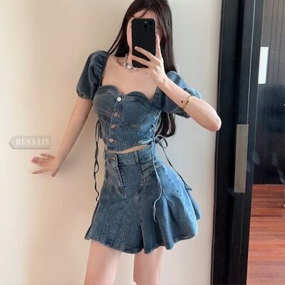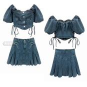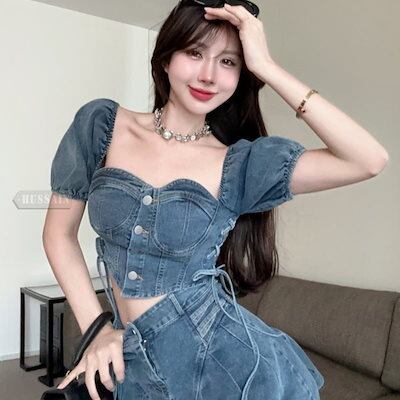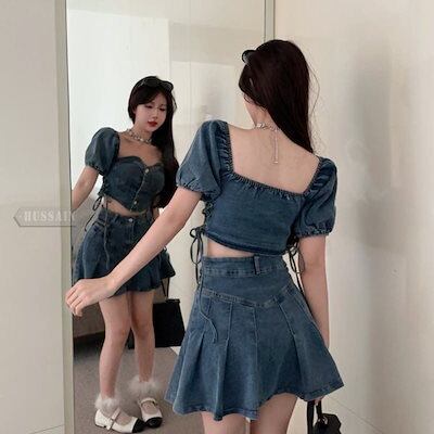 デニム ブラウス プリーツスカート 2点セット ミニスカート バックシャン スクエアネック 半袖 ショート レースアップ ボトムス トップス ミニ丈 レディース フェミニン カジュアル 上下セット