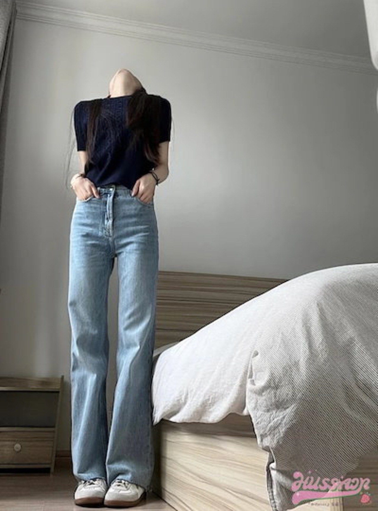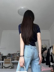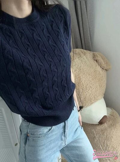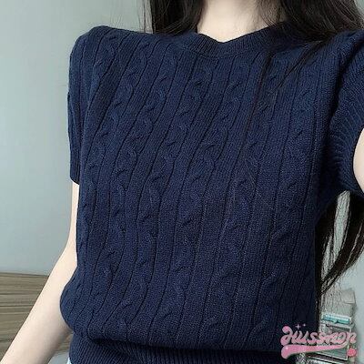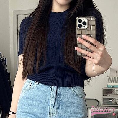 トップス ニット ラウンドネック 半袖 スリム 細見え 丈短め ネイビー シンプル 無地 かわいい おしゃれ カジュアル 秋 韓国ファッション レディース お出かけ