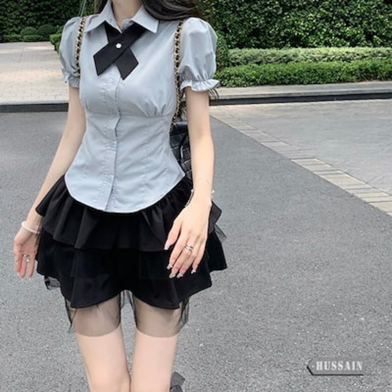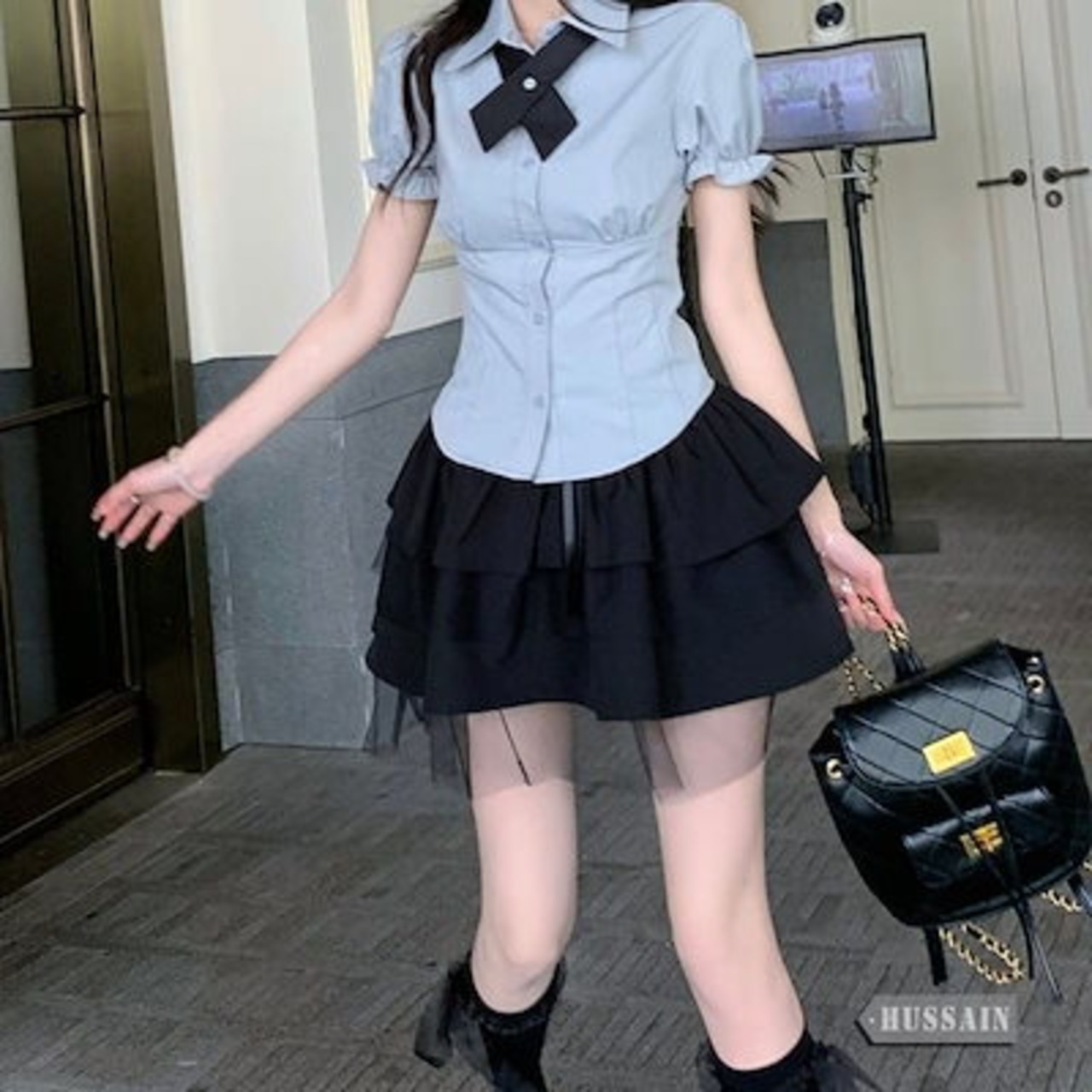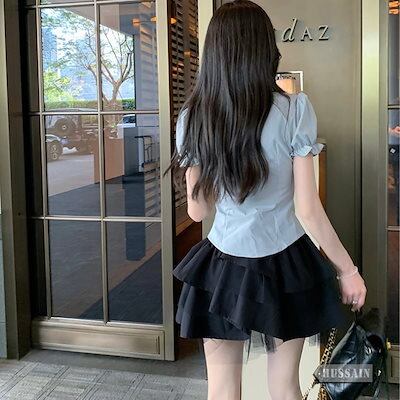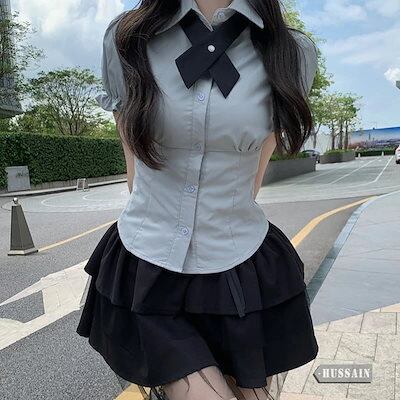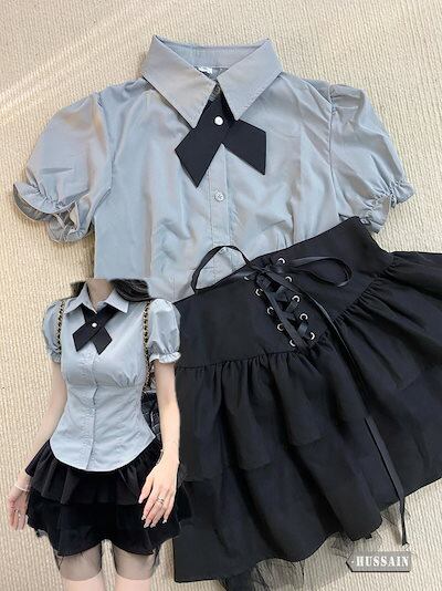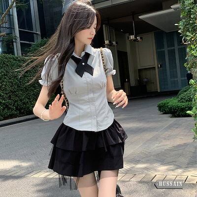 パフスリーブ ブラウス コルセット ティアードスカート セットアップ シャツ リボン 半袖 トップス ハイウエスト ミニスカート レース ボトムス 美脚 脚長 韓国レディース 女っぽ 制服 上下セット