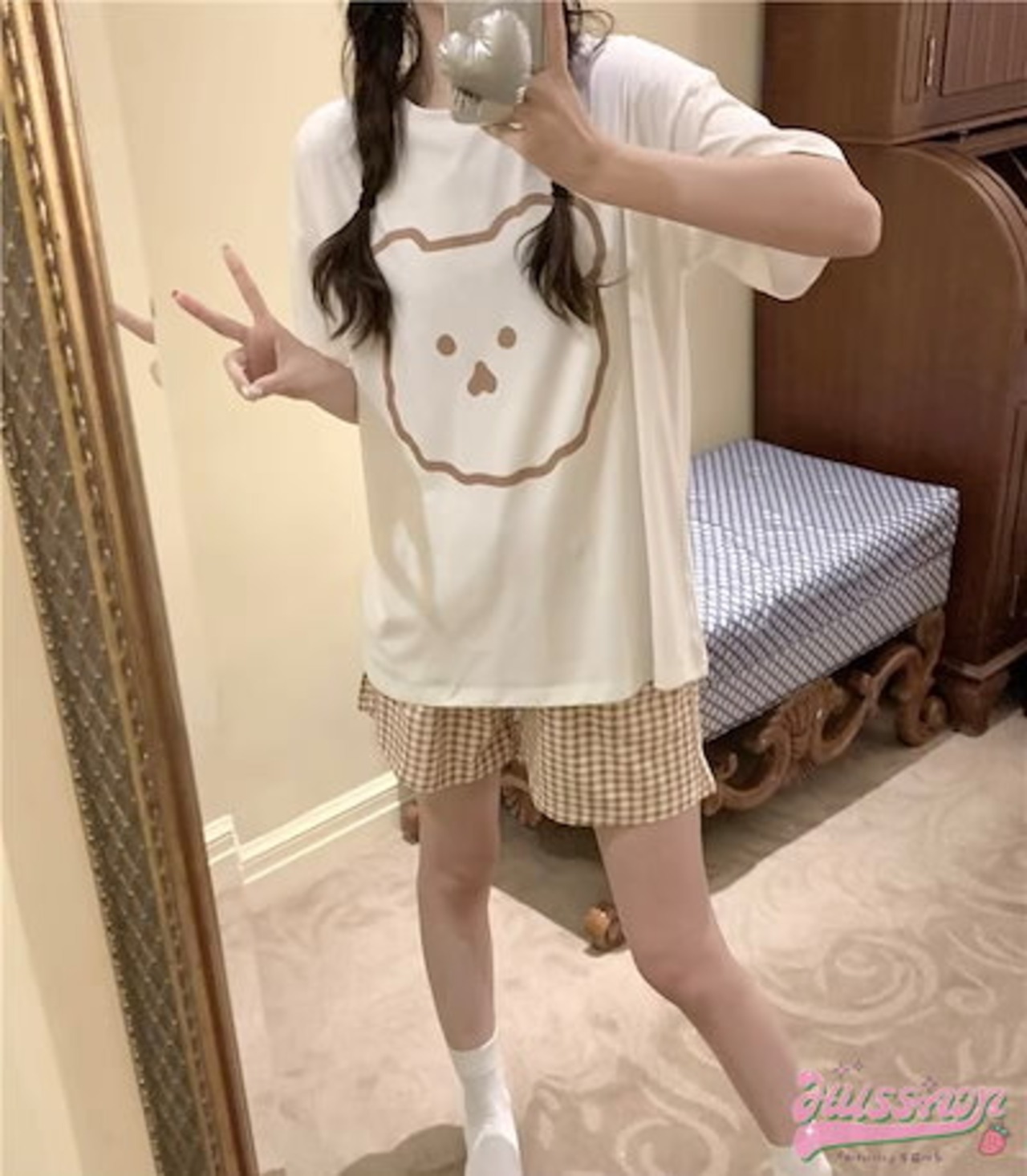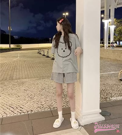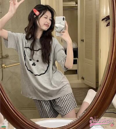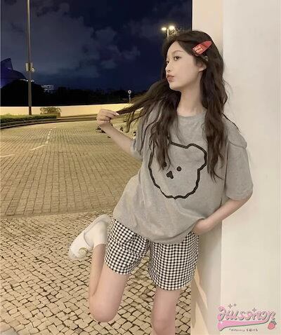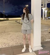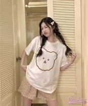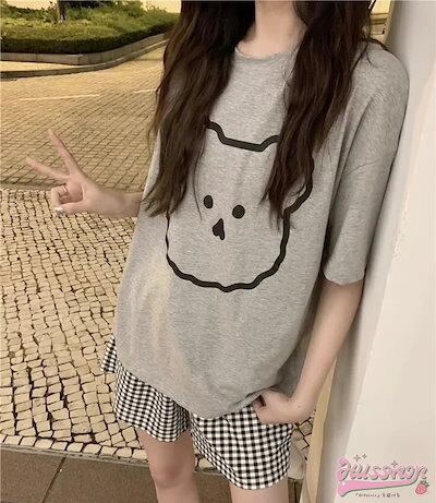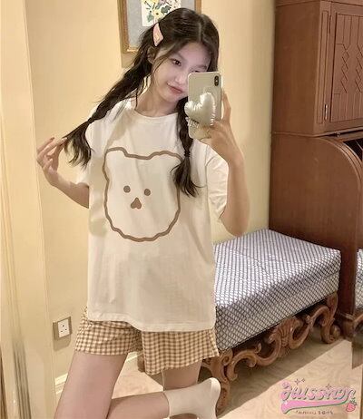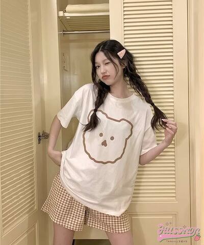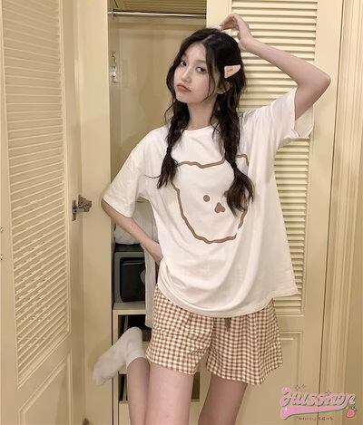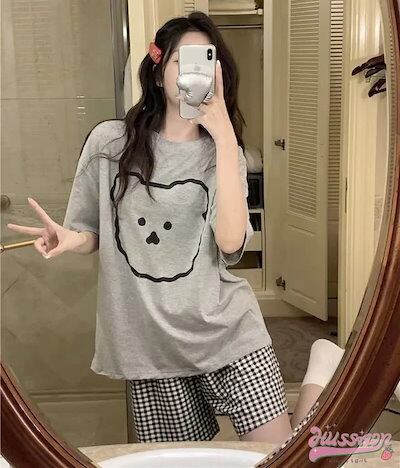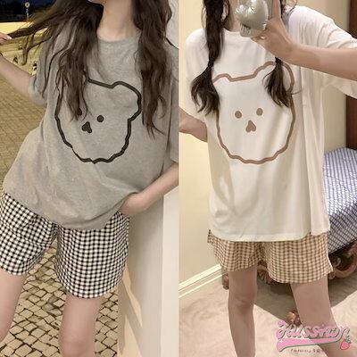 セットアップ トップス Tシャツ 半袖 ラウンドネック クマ イラスト ゆるキャラ ショートパンツ ギンガムチェック ゆったり リラックス かわいい ルームウェア 部屋着 夏 韓国ファッション レディ