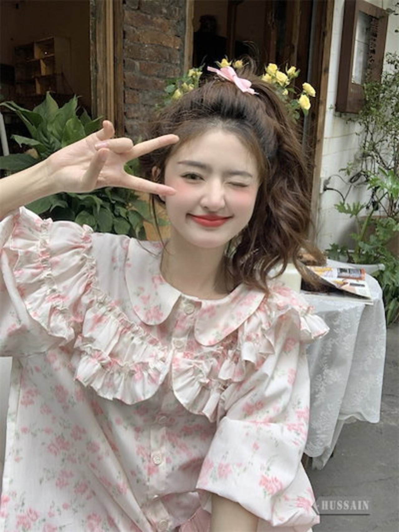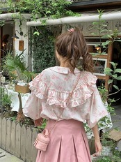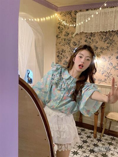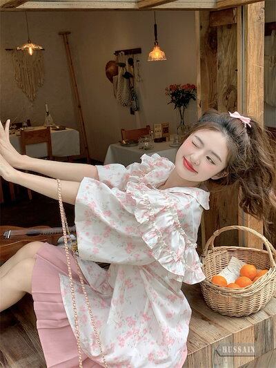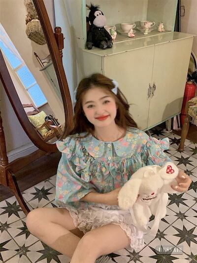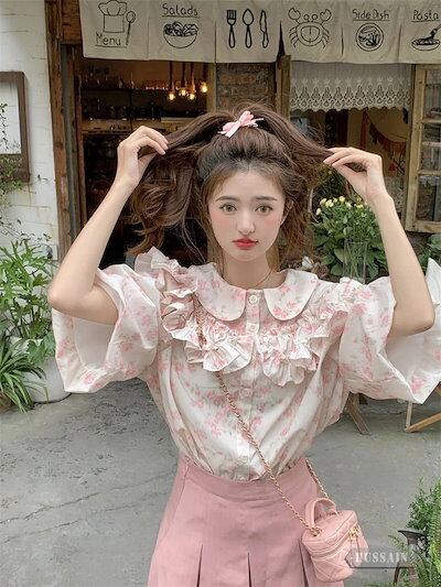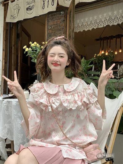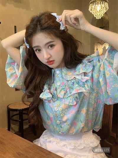 トップス ブラウス 5分袖 フリル 2色展開 夏 レディース 花柄 ボタン ラウンドネック パフスリーブ 甘い ゆったり ルーズ 可愛い おしゃれ