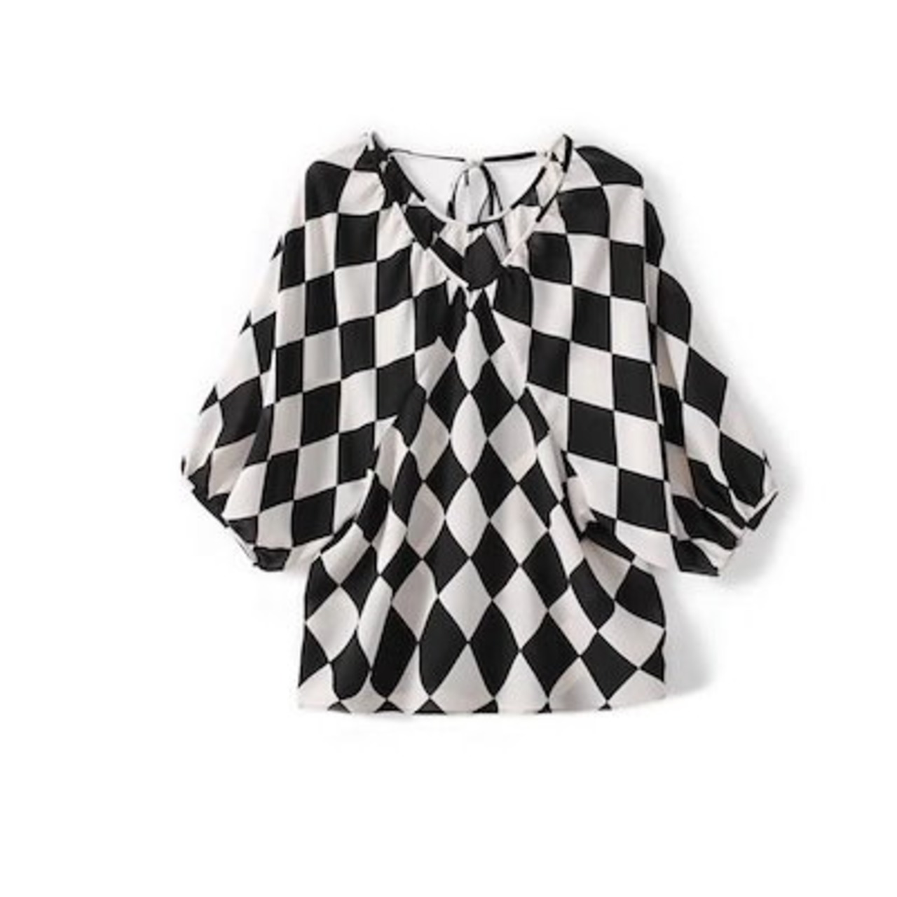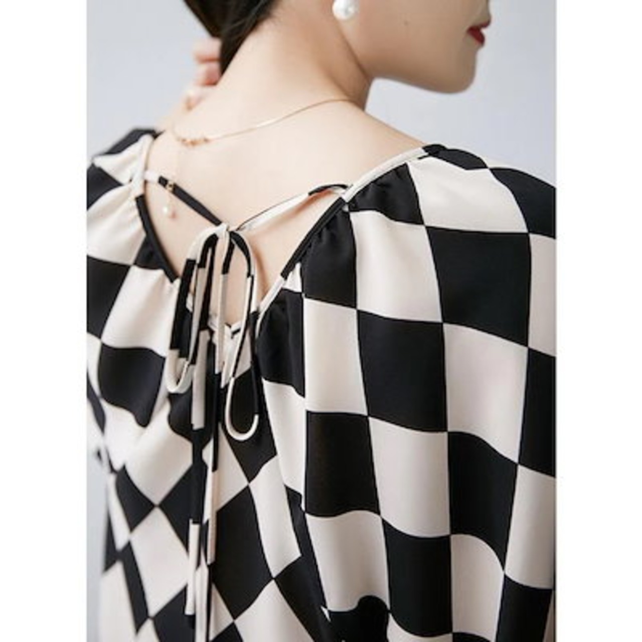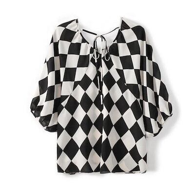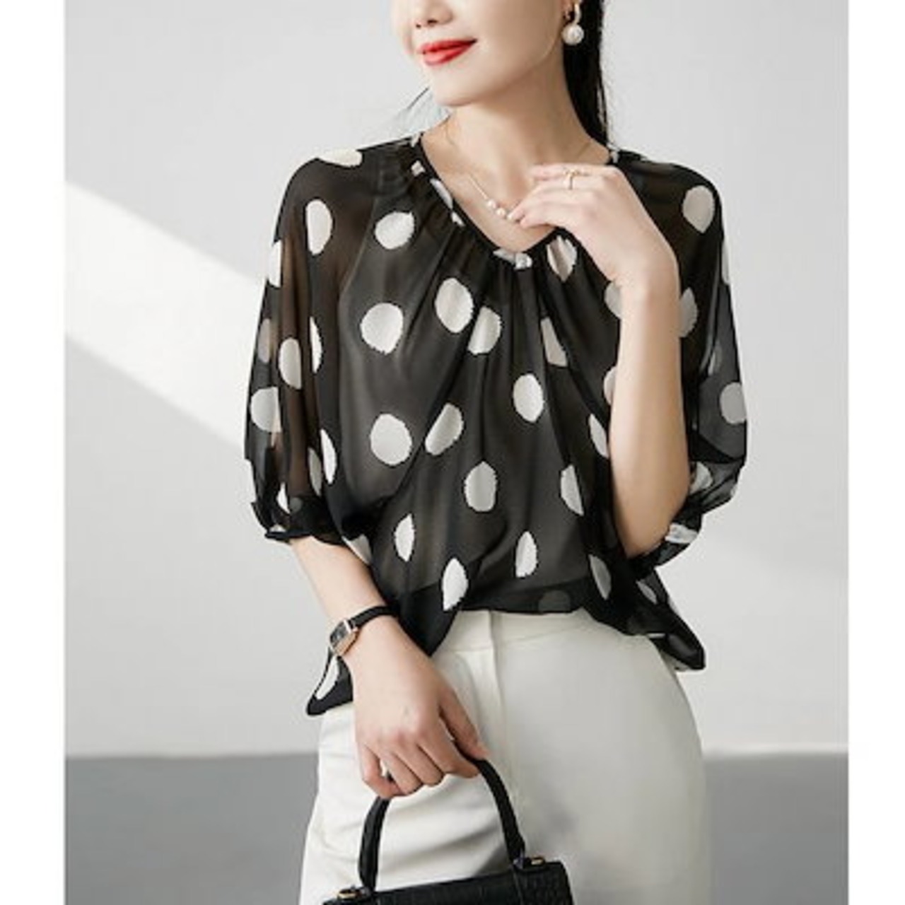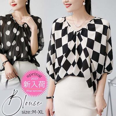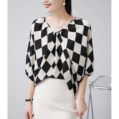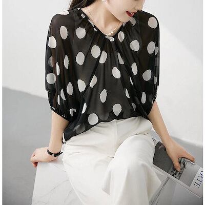 ブラウス レディース 40代 夏 オシャレブラウス 五分袖トップス Vネックブラウス 幾何柄 ドット柄 シフォンtシャツ ドルマンスリーブ ゆったりtシャツ 通勤OL