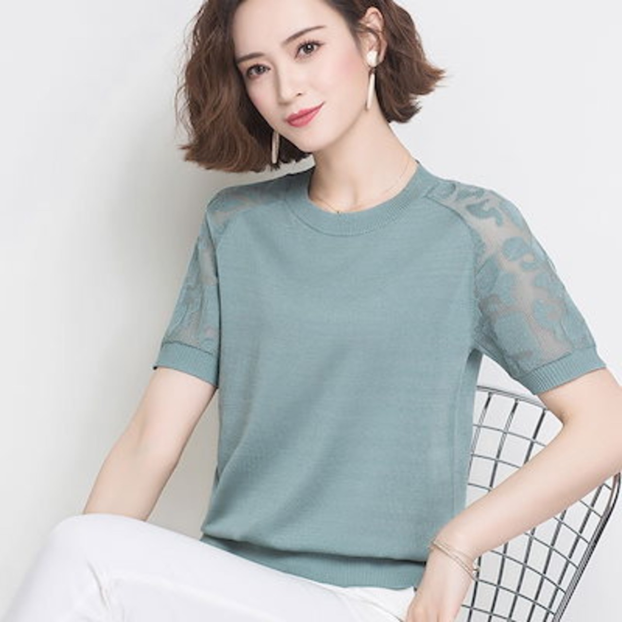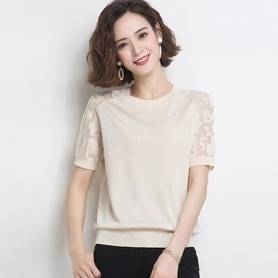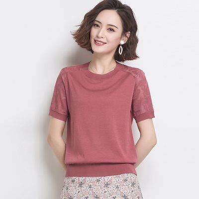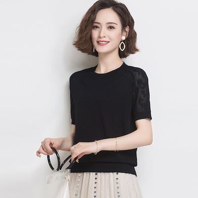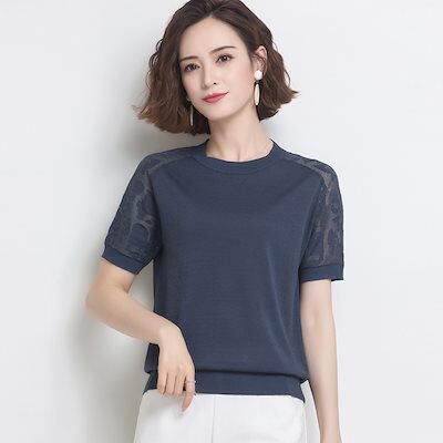 Tシャツ レディース 春夏新作 40代 半袖 ニットトップス 無地Tシャツ レース切り替え レション ショット丈ニットソー ゆったりカットソー おしゃれ 大人 50代