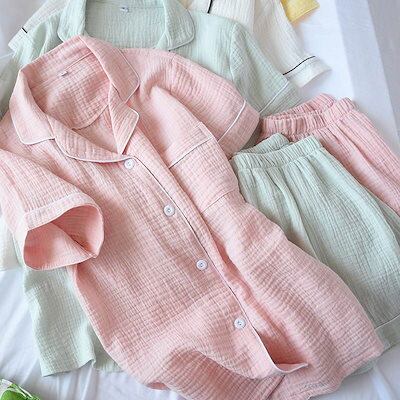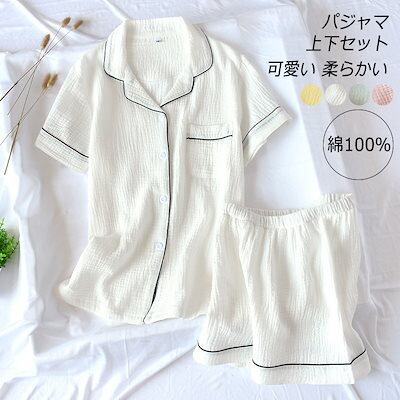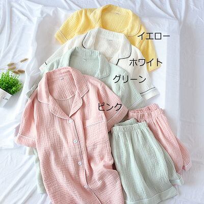 ルームウェア レディース 綿100% 夏 パジャマ ナイトウェア トップス パンツ 上下セット 綿 ガーゼ 半袖シャツ おしゃれ 可愛い セットアップ ワイドパンツ 前開き vネック 半袖 女の子 ゴ