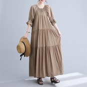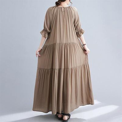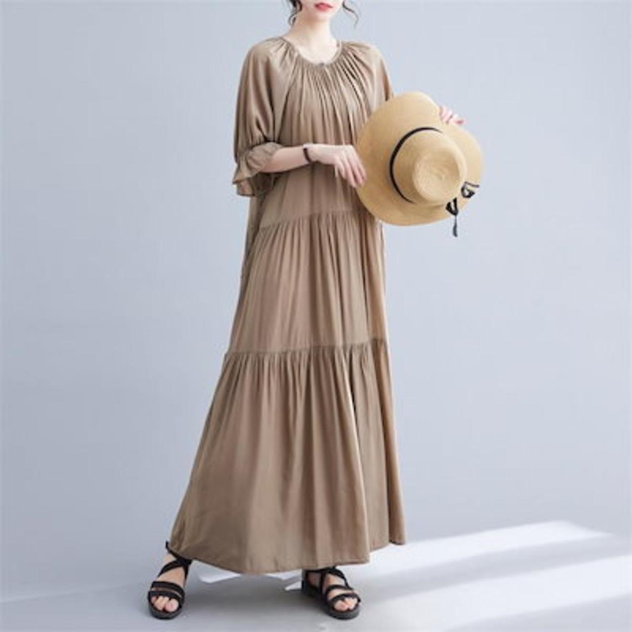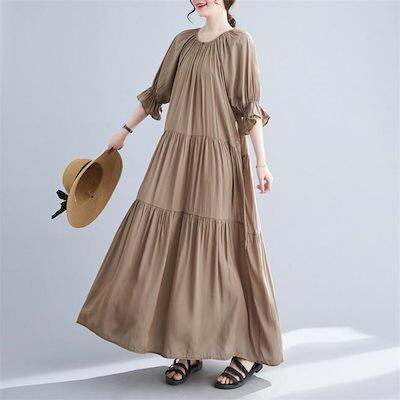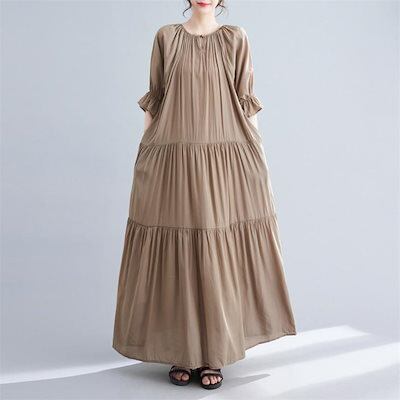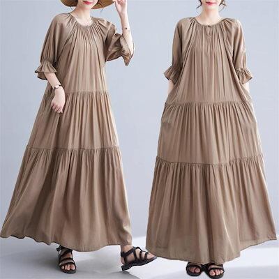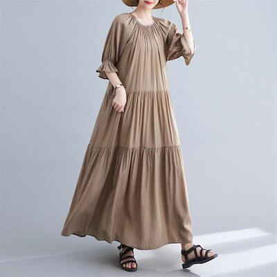 ワンピース ロング丈 レディース 夏トップス 五分袖 クルーネック 大きいサイズ ティアード ワンピース 女性らしいキレイな色展開 クラシックな雰囲気