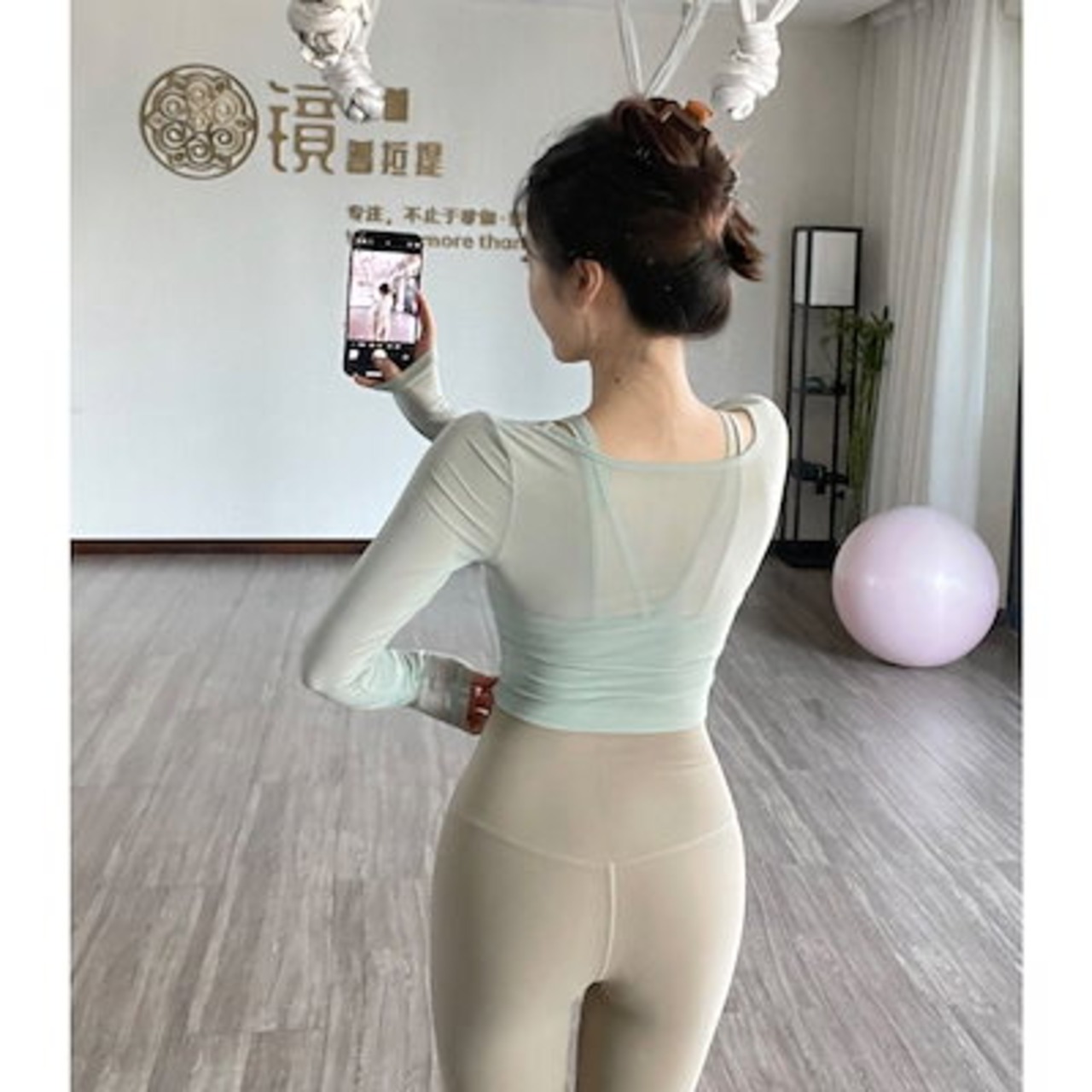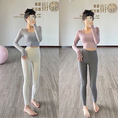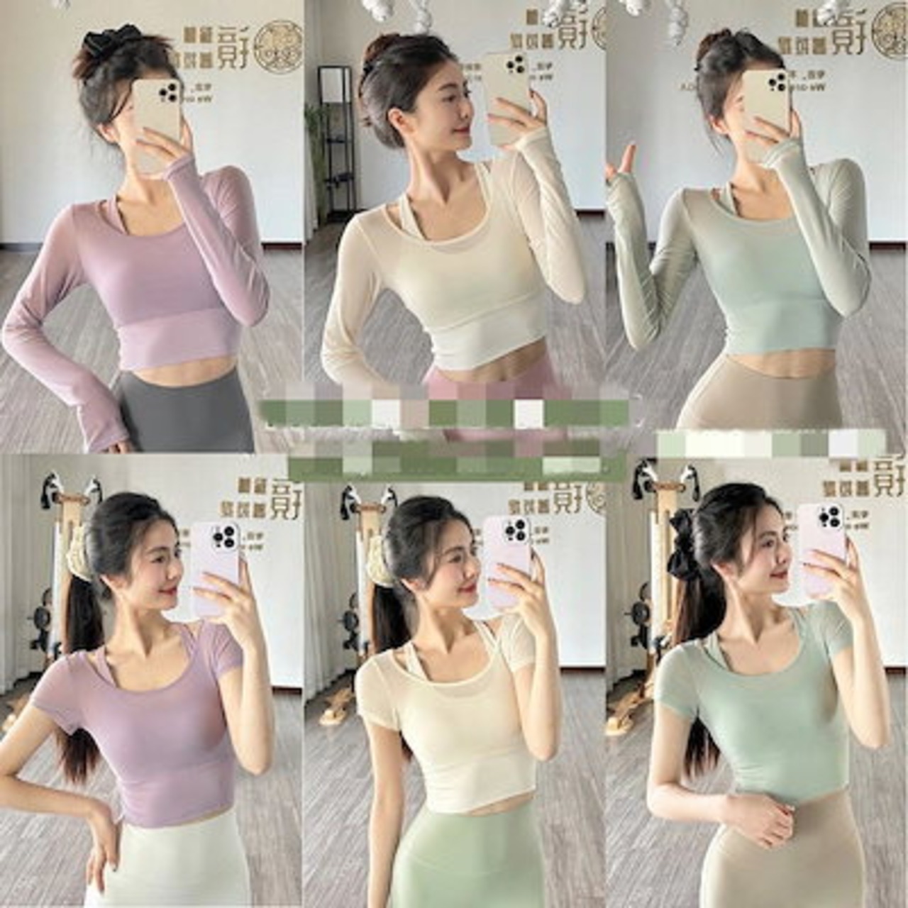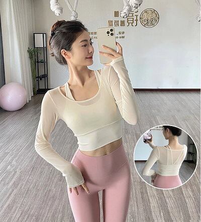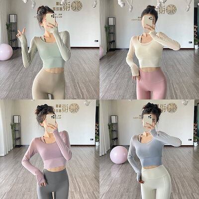 レディース フェイクレイヤード 首をかける 運動 トップス タイト へそ出しです 長袖 半袖 ヨガウェア