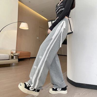 ワイドパンツ リボン刺繍ストライプワイドレッグパンツレディース秋ハイウエストストレートドレープドラッグパンツ30%までに制限