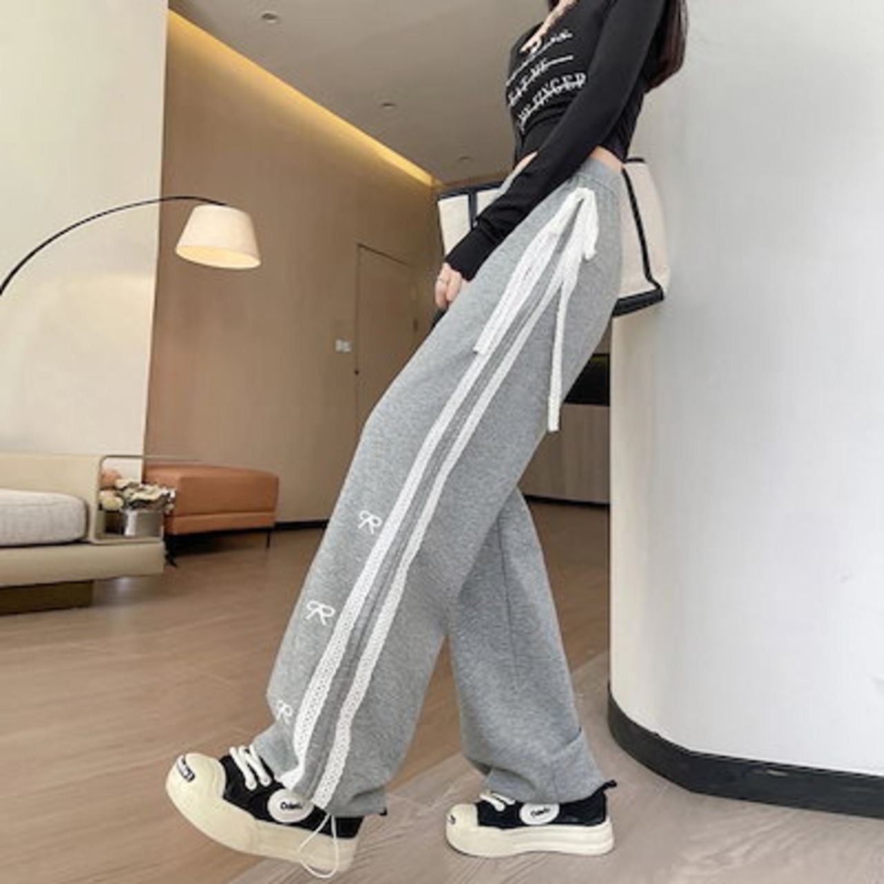 ワイドパンツ リボン刺繍ストライプワイドレッグパンツレディース秋ハイウエストストレートドレープドラッグパンツ