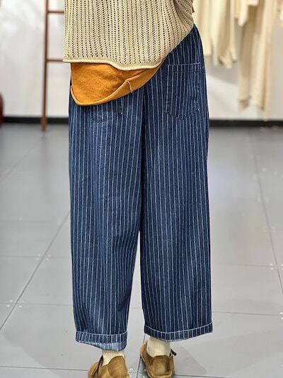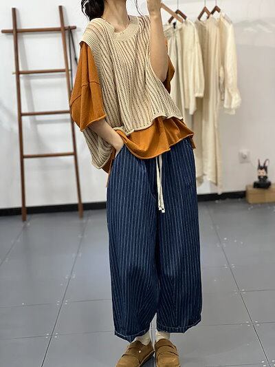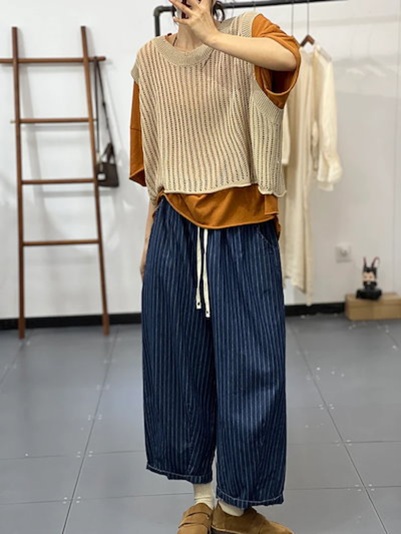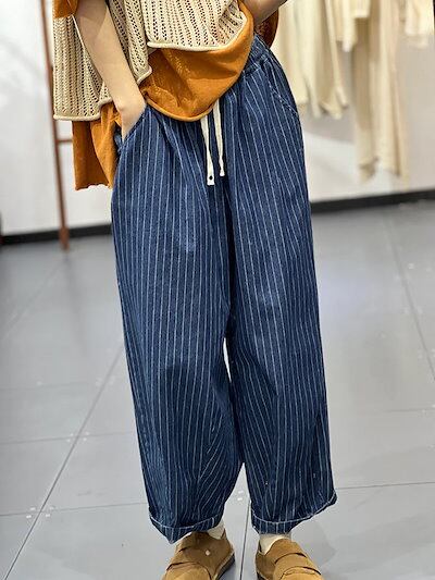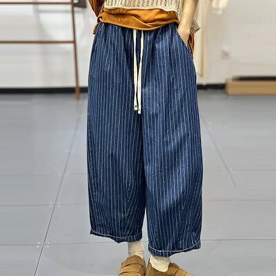 夏服レディースジーンズ軽薄純綿ガウチョパンツデニムハイウエストズボン韓国ファッション大きいサイズゆったりカジュアルストライプワイドパンツ