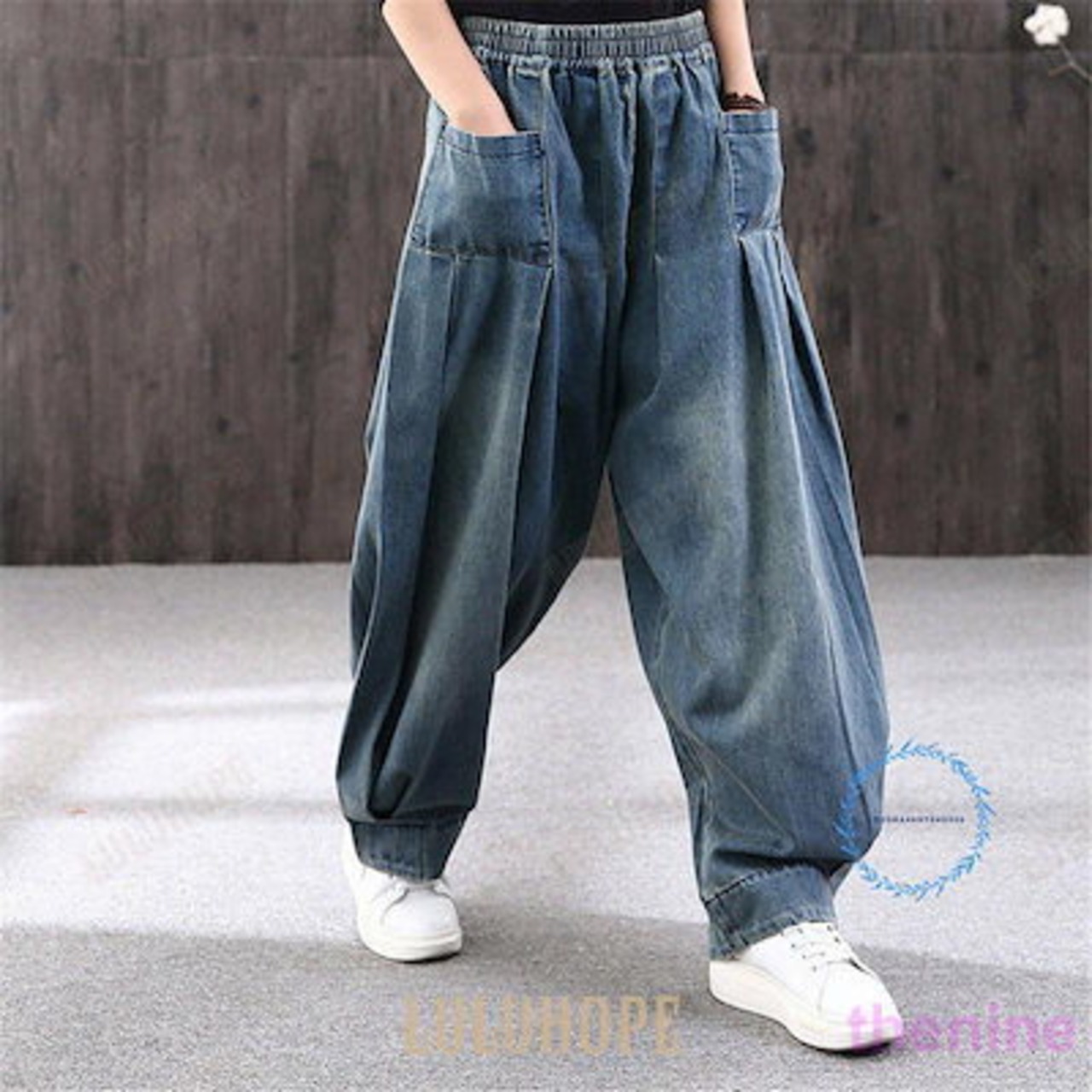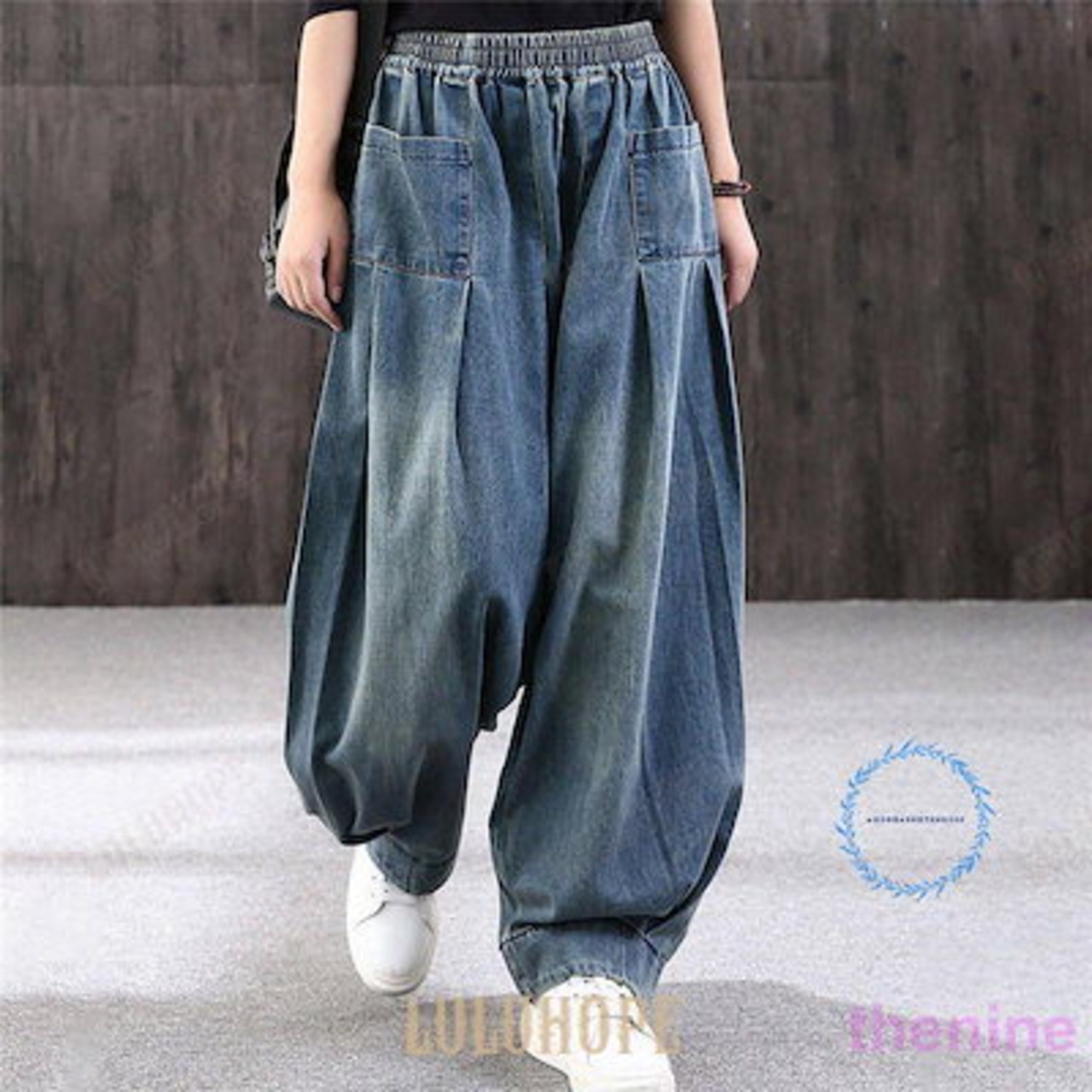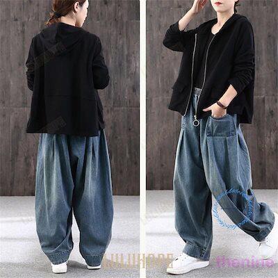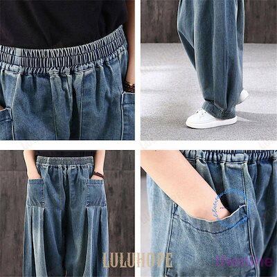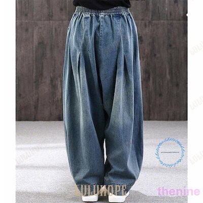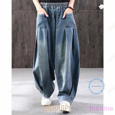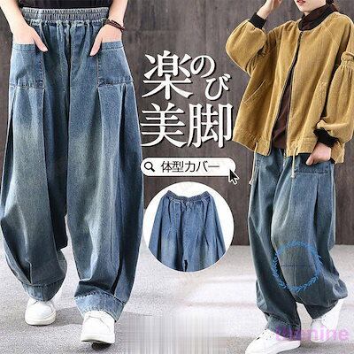 ワイドパンツ レディース デニム ジーンズ サルンツ おしゃれ ウゴム 大きい ゆったり カジュアル 春 秋 体型カバー 50代