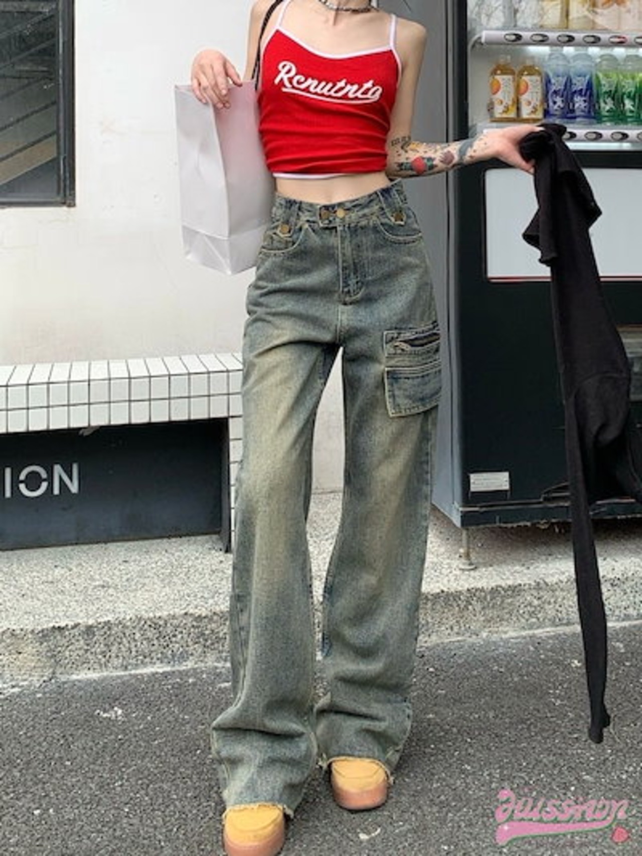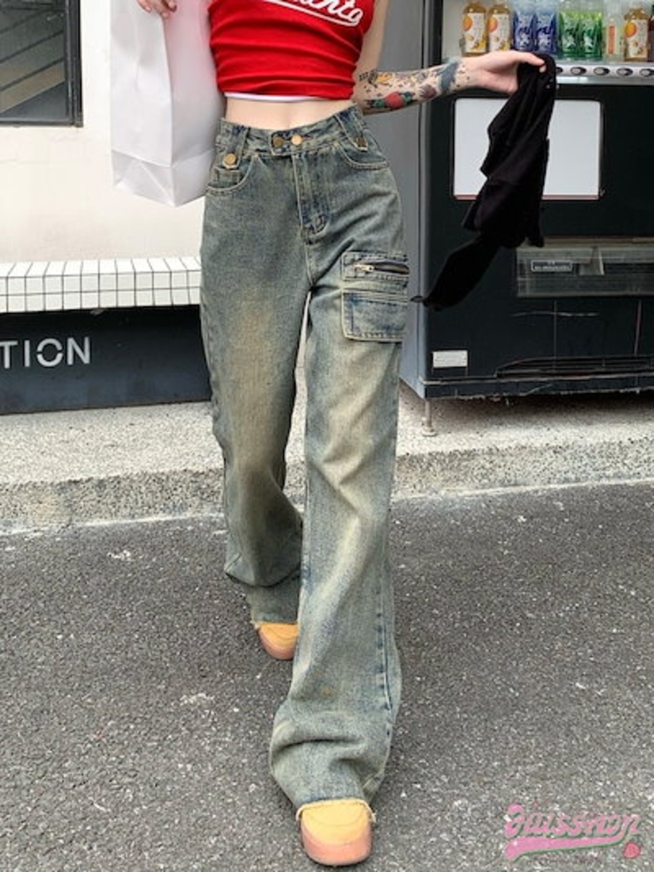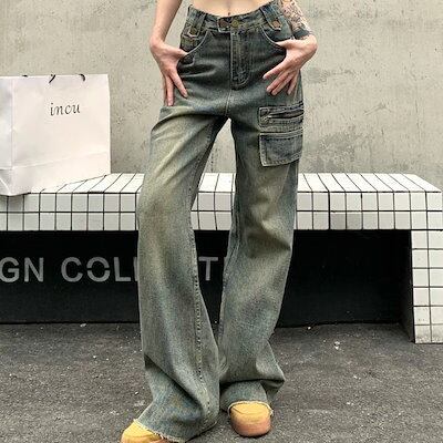 パンツ デニム ジーンズ ワイド ストレート ハイウエスト 脚長効果 美脚効果 細見え ウォッシュ加工 フリンジ 春 カジュアル 韓国ファッション レディース お出かけ